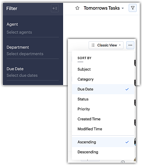 The view can be narrowed down by filtering the tasks by agent, department, and due date. Likewise you can also sort the tasks based on category they belong, priority, status, created time, and more to view them as per the requirement.