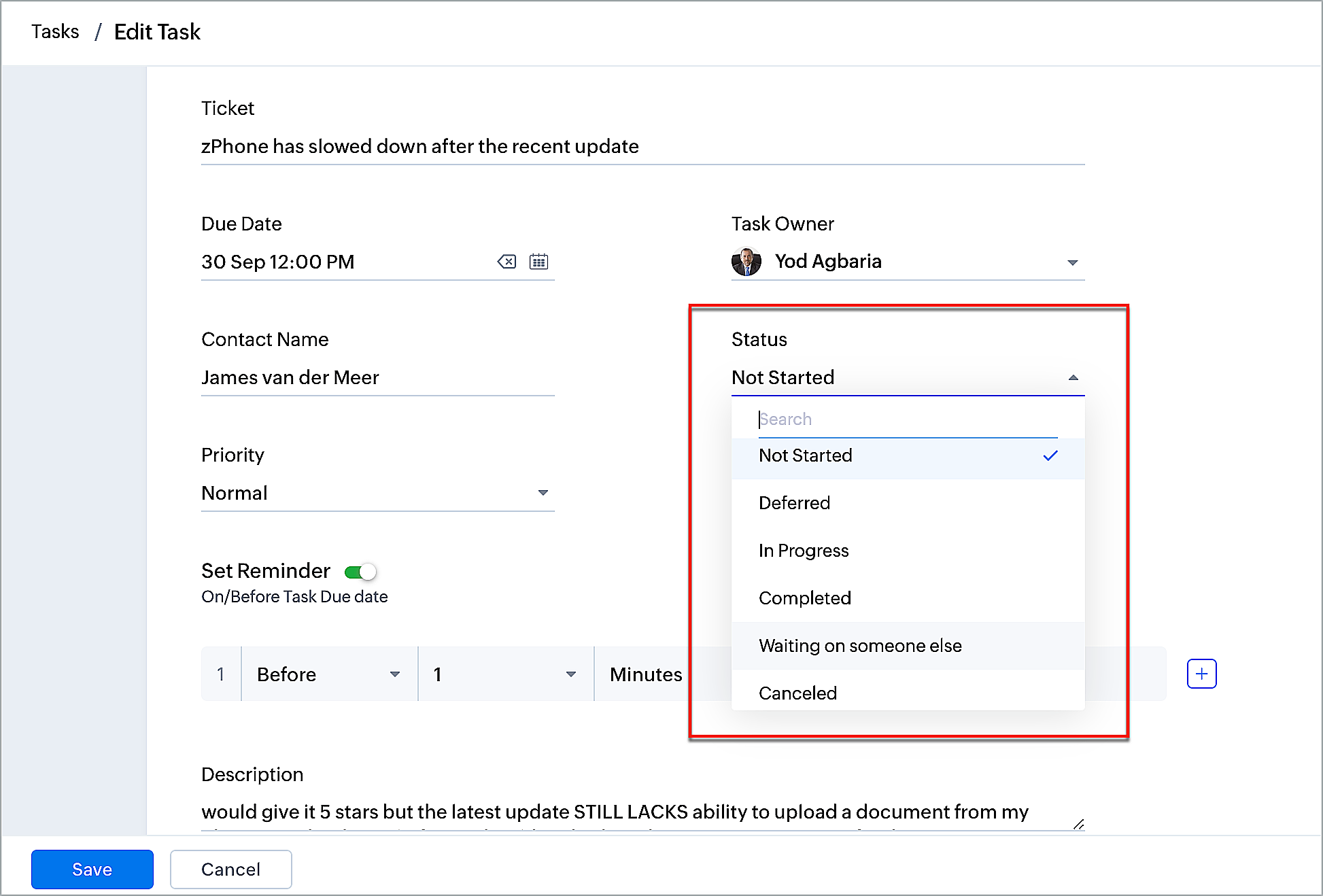 Status: While working on multiple tasks, it is important to update their status as they progress from one stage to another. It gives a clear idea to the agent and also helps them prioritize and track their daily activities.