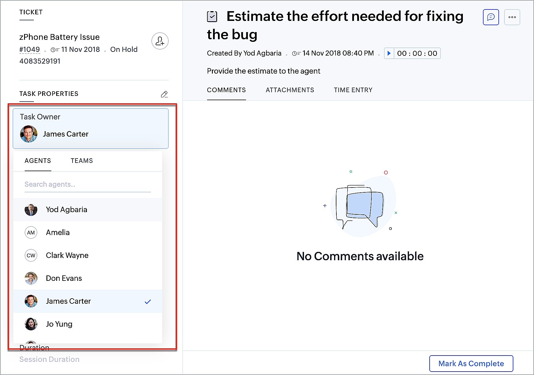 Consider the above scenario where the agent has to collaborate with the payments team for refund. They can create a task and directly assign it to the payments team, that can be taken up by the right person. This saves time and effort and also streamlines the process.
