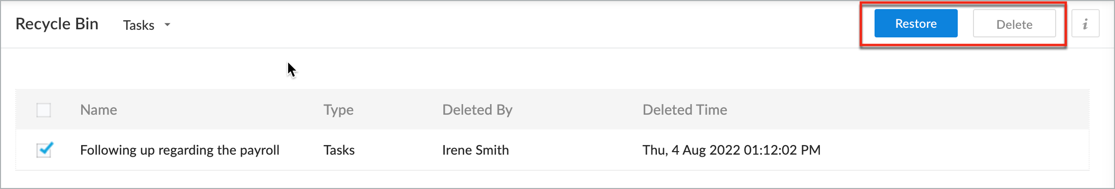 - Select the tasks that you want to restore and click Restore from the upper-right corner.