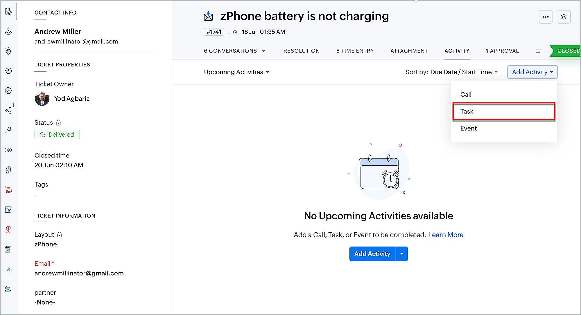 If the task is created for a customer whose record is already available in Zoho Desk, then you can select the contact.