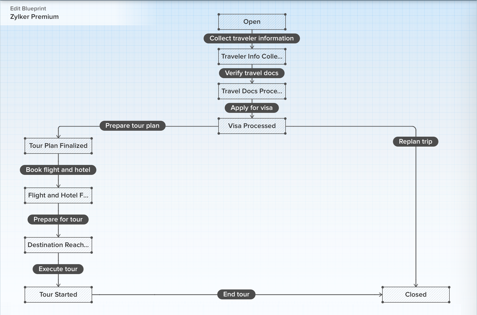 A lengthy process like Zylker's Premium package, which involves multiple stakeholders and touch-points working offline, can benefit greatly from a Blueprint. Let us see how.