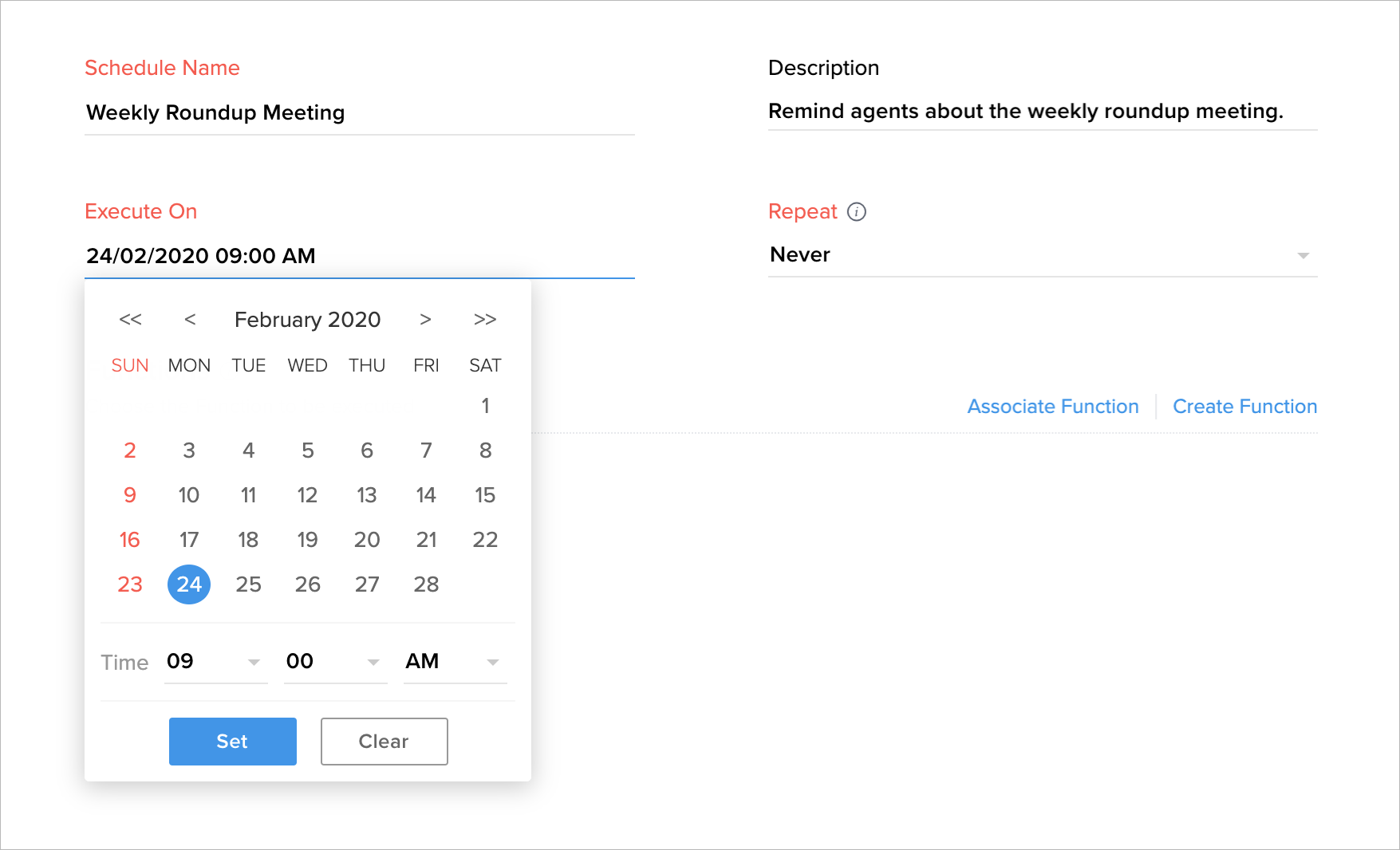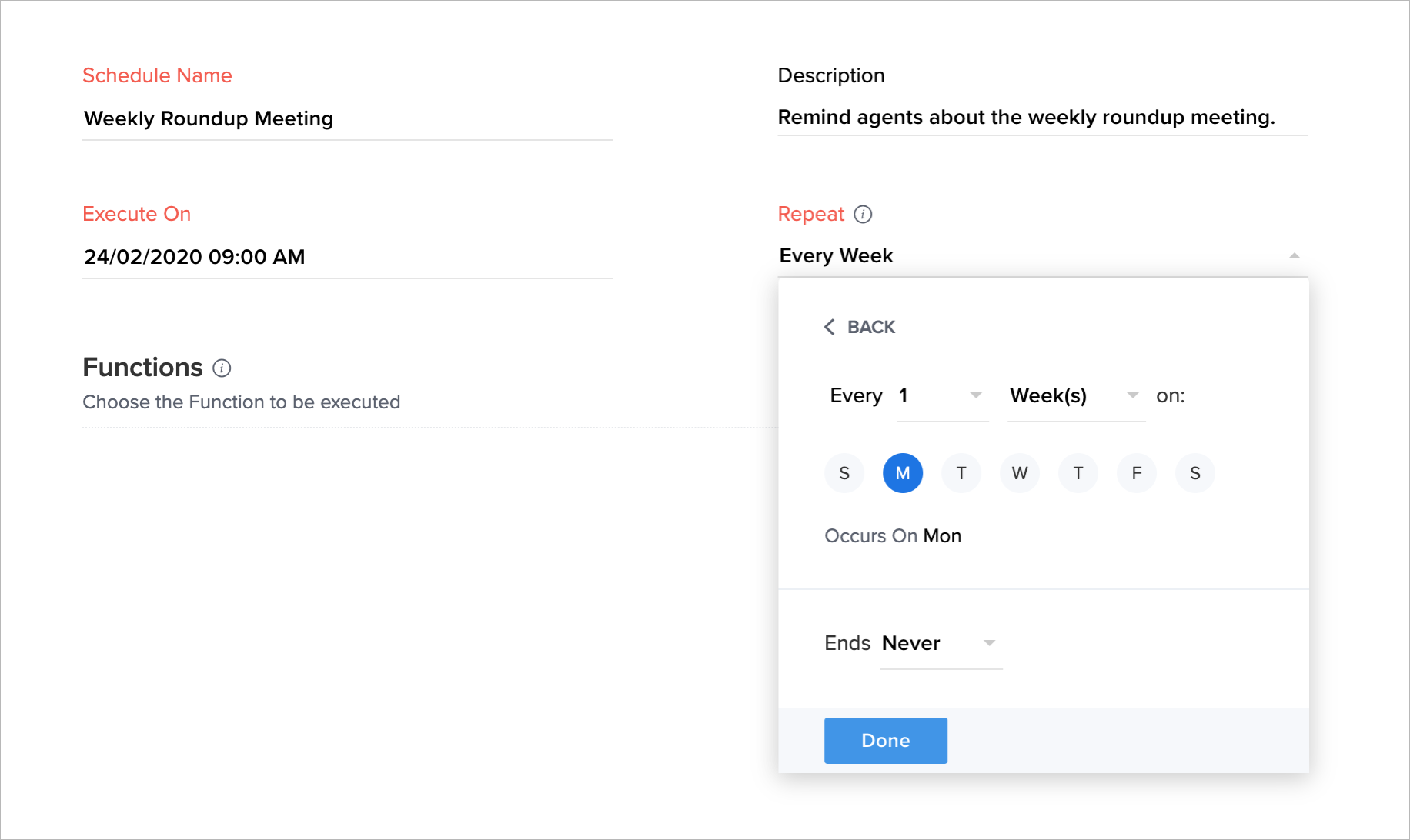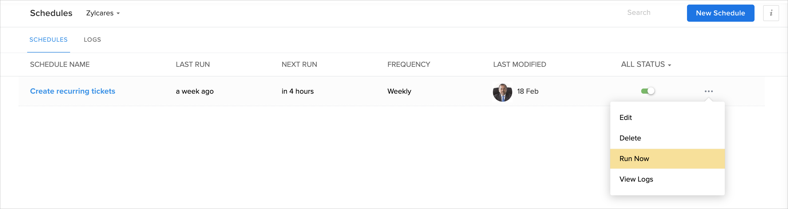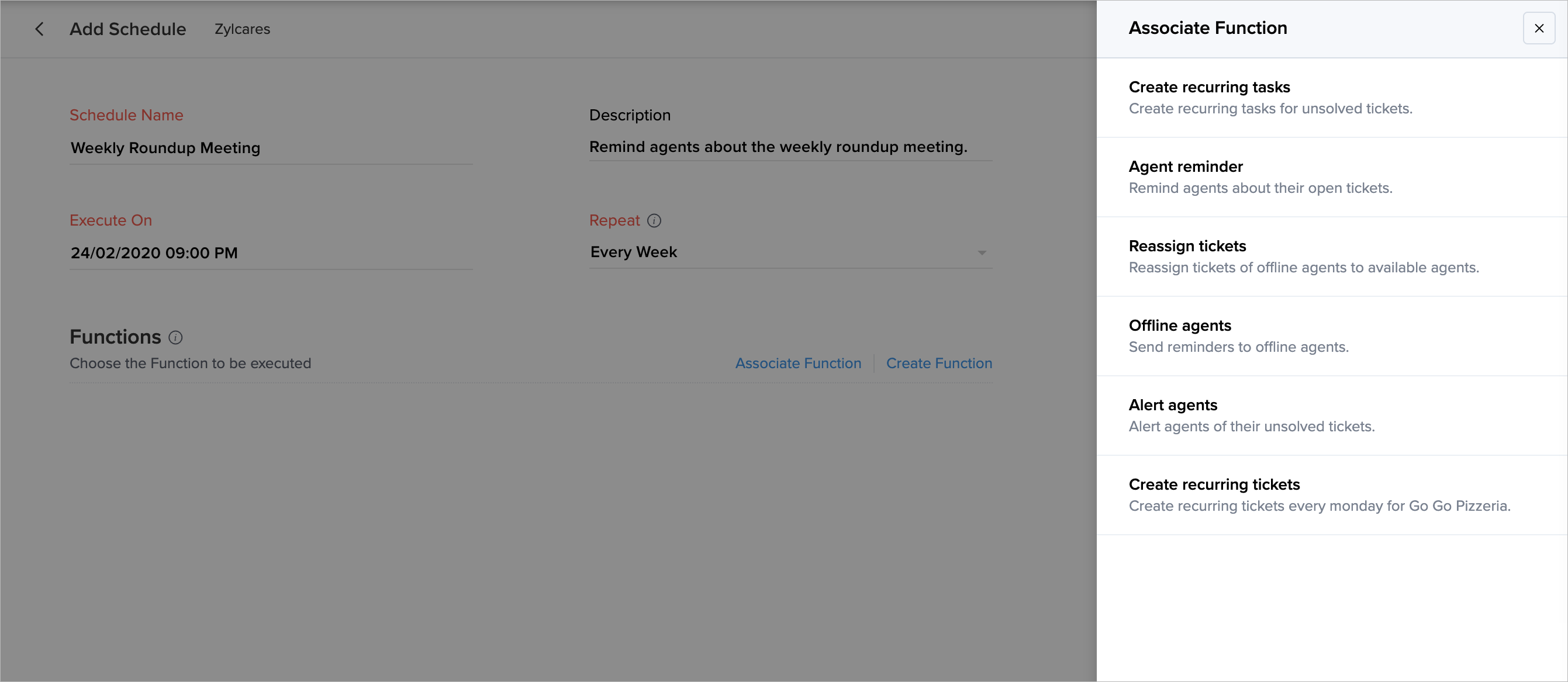 Schedules are automated user-defined actions, which can be executed through custom functions either at a particular time or on a recurring basis. For example, using schedules, you can create a new ticket/task on a recurring basis or send reminders about a weekly meeting to agents.
