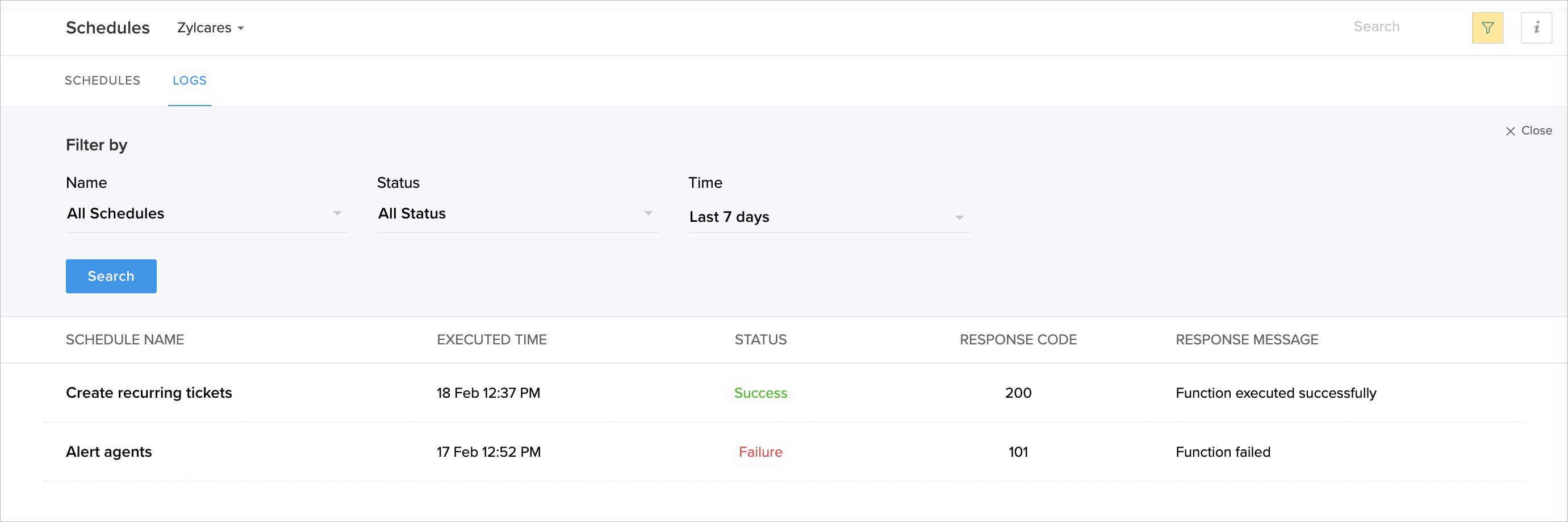 Every schedule's execution details, whether it was a failure or successful, will be displayed under the Logs tab. You can also filter the logs to focus on the data you want to see. For example, you can filter the logs stream by a schedule, status, or a particular period.