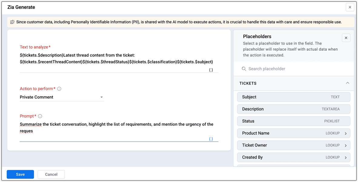 For example, if a customer sends an email for onboarding with an on-site implementation request and enquiring about a long-term facility to provide a continuous training certification to its employees, Zia can analyze the thread content, ticket subject, description, and prompt, such as: "Summarize the ticket conversation, highlight the list of requirements, and mention the urgency of the request" to generate a summary which can be added as a private comment for the concerned stakeholders to refer.