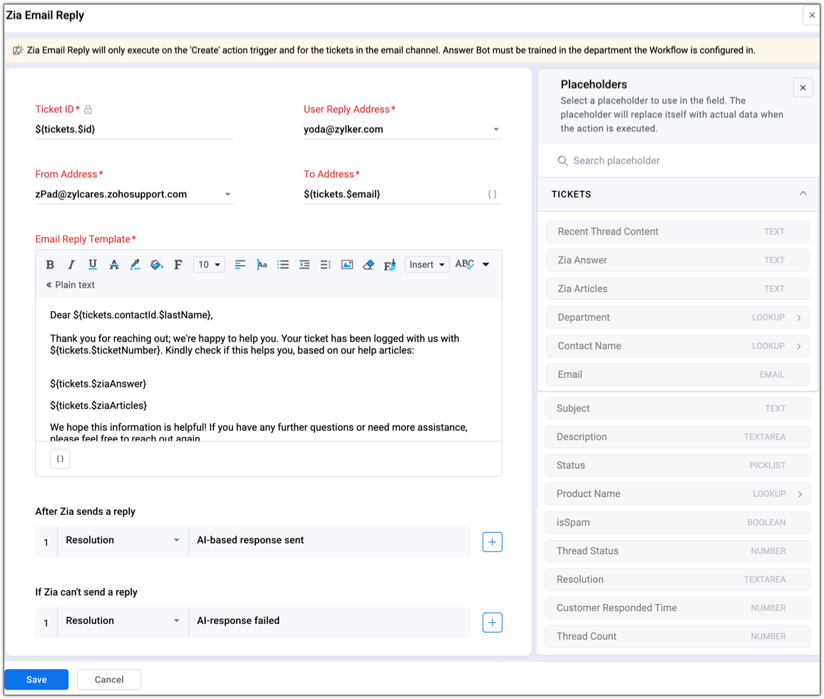 - Answer Bot must be configured and trained using the KB articles before setting up Zia email replies. This is important as Zia can draft a response and provide suitable knowledge base articles in the email only if Answer Bot is trained to identify and analyze similar queries. Read more about AI-based self-service through Answer Bot