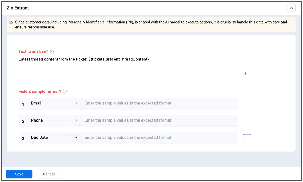 Zia can extract values such as email, phone number, due date, case type, product code, order number, purchase date etc from the ticket conversation and autopopulate them in the ticket. This saves time and considerably reduces the chances of missing out on important details and inadvertent errors while entering values manually.