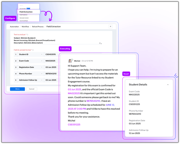 - Zia intercepts the email, identifies the fields present in the layout, and maps them with the details mentioned in the email (eg., Exam code, Student ID, Contact number, Registration date, Admission follow-up date etc.).