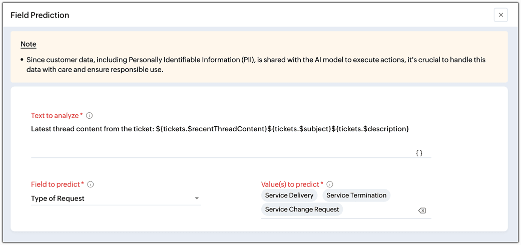 For example, when a ticket is received if Zia predicts the 'Problem Type' as 'Manufacturing Defect' and later the customer sends an email with more details and field prediction action analyzes the content and intercepts the 'Problem Type' as 'Faulty Device' the original predicted value will be replaced with 'Faulty Device'.