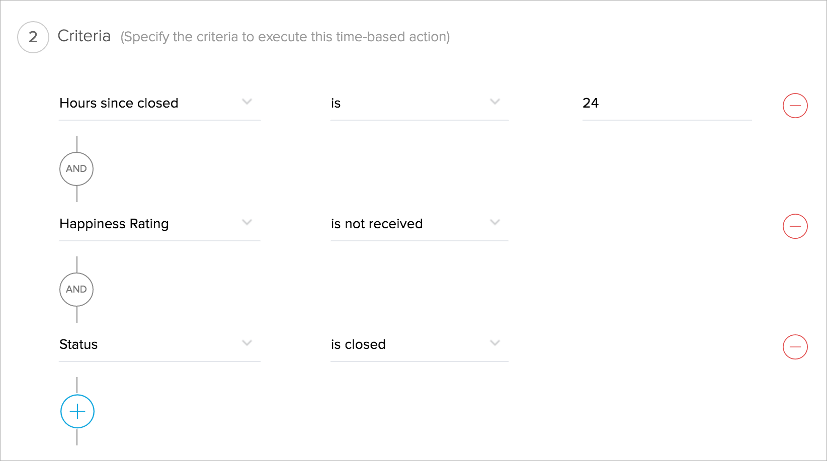 Part 1: Enter the Rule Name and specify Business Hours as Calendar Hours.Part 2: In the Rule Criteria section, specify: <Hours since closed> is <24> (AND)<Happiness Rating> <Link not provided> (AND)<Status> is <Closed>