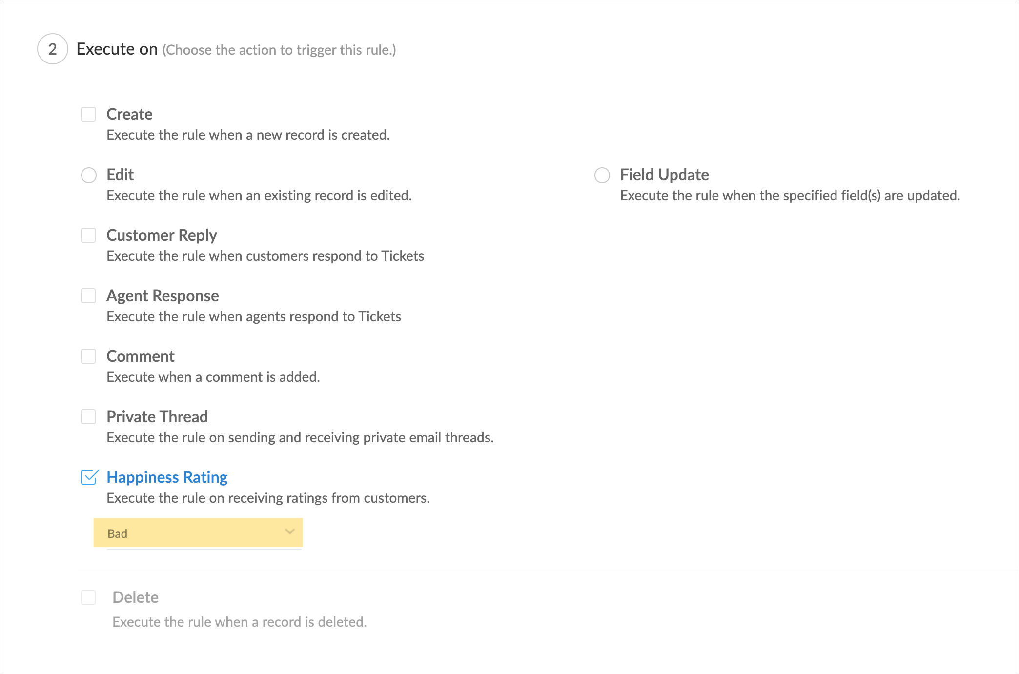 Part 1: Select the [Tickets] module and enter the Rule Name.Part 2: You must choose to execute the rule based on Happiness Rating (for) Bad ratings.Part 3: In the Rule Criteria section, specify <Status> is <Closed>.