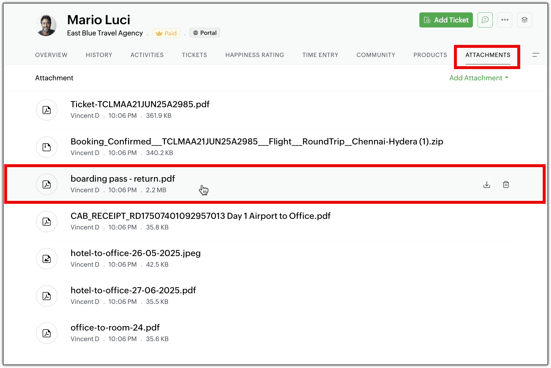 Agents can attach documents or notes that may be specific to the contact for reference purpose and also for their senior team members and peers who may have access to the record. for eg., agents can attach a copy of the SLA or the Contract agreement to keep all stakeholders in loop.