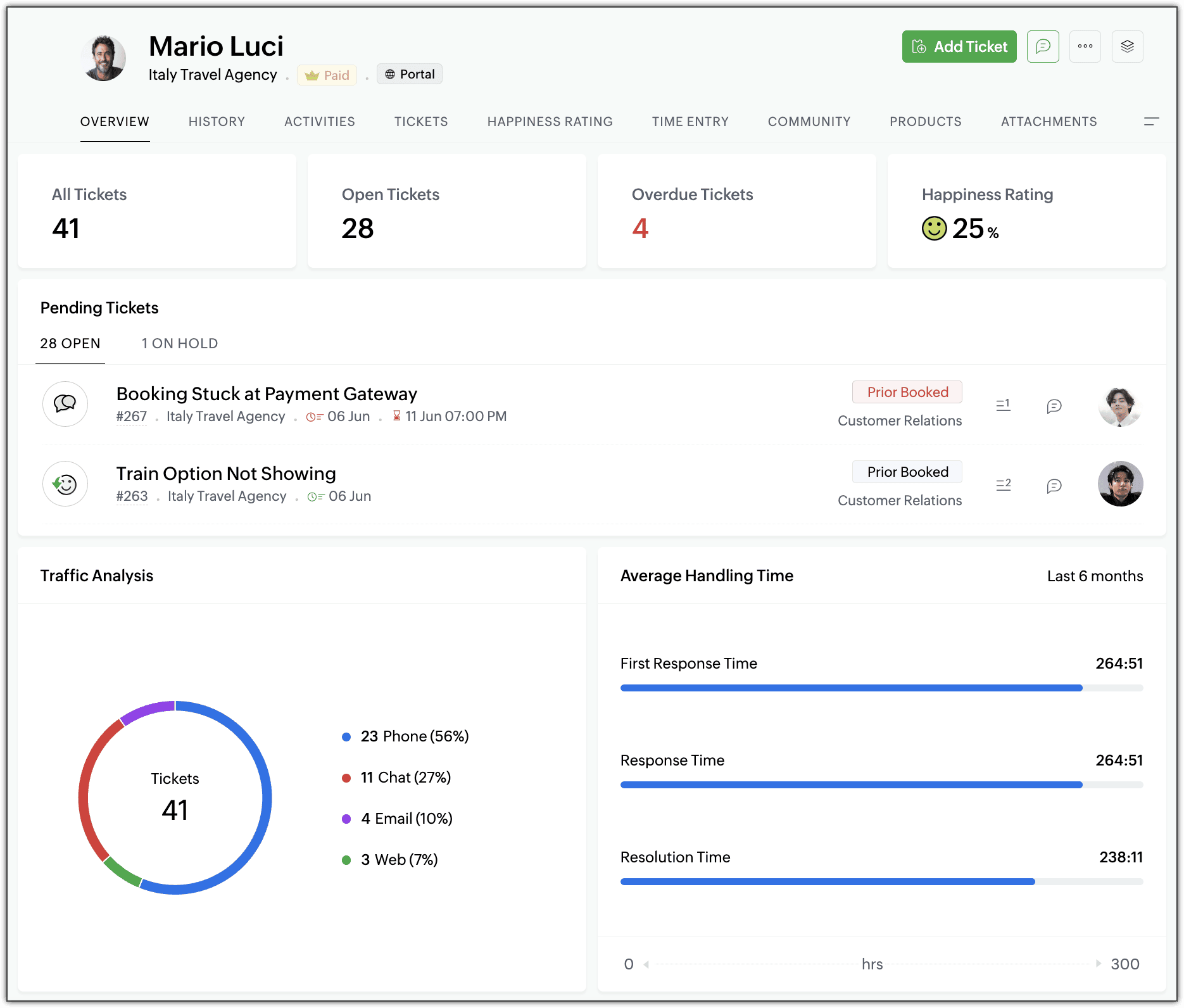 The Overview tab provides a comprehensive summary of all support-related activity for the agent, support lead, or ticket owner. It shows how the contact has interacted with the support process—such as how many tickets they've raised, the current status of those tickets, their response time, how often they've replied, and how the support team has responded.