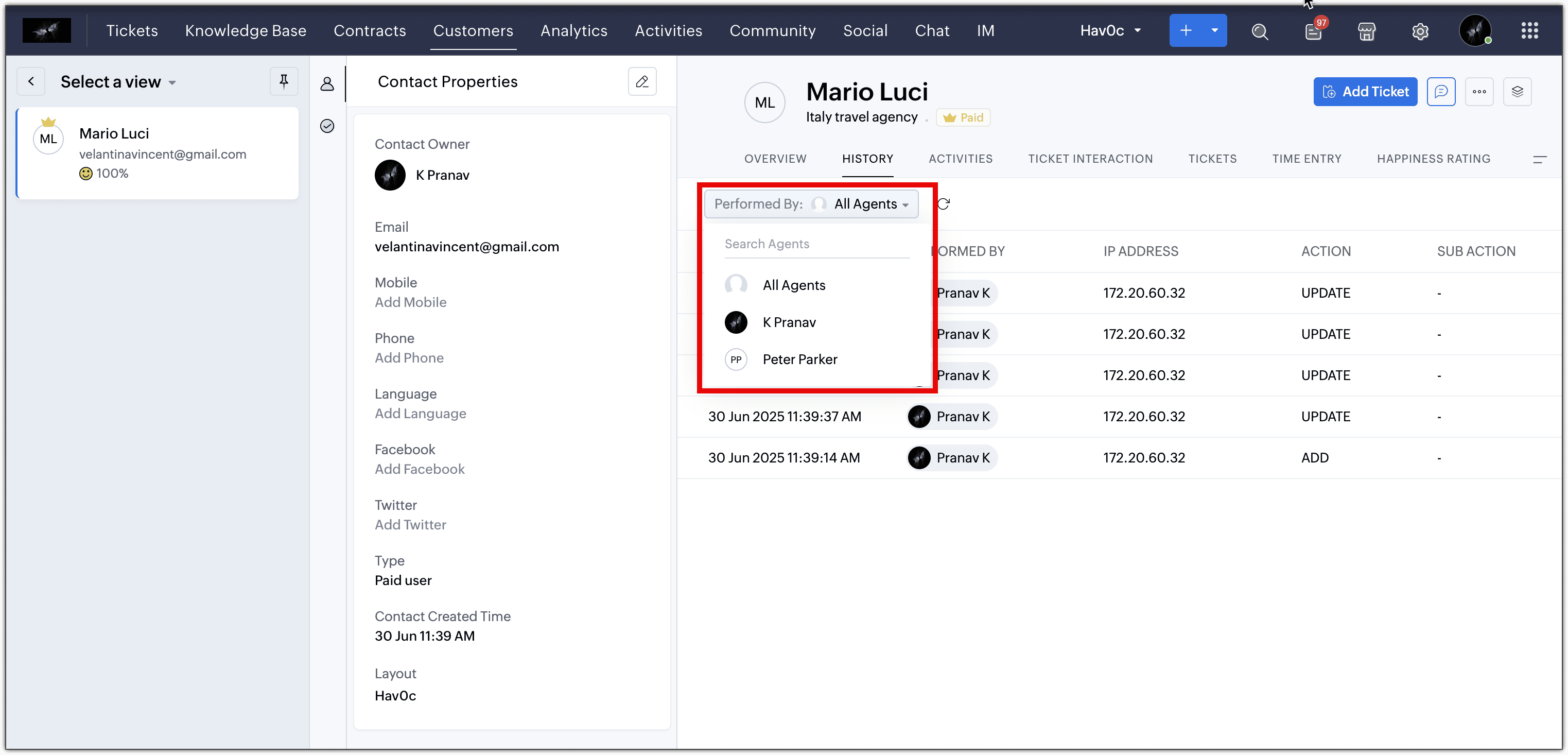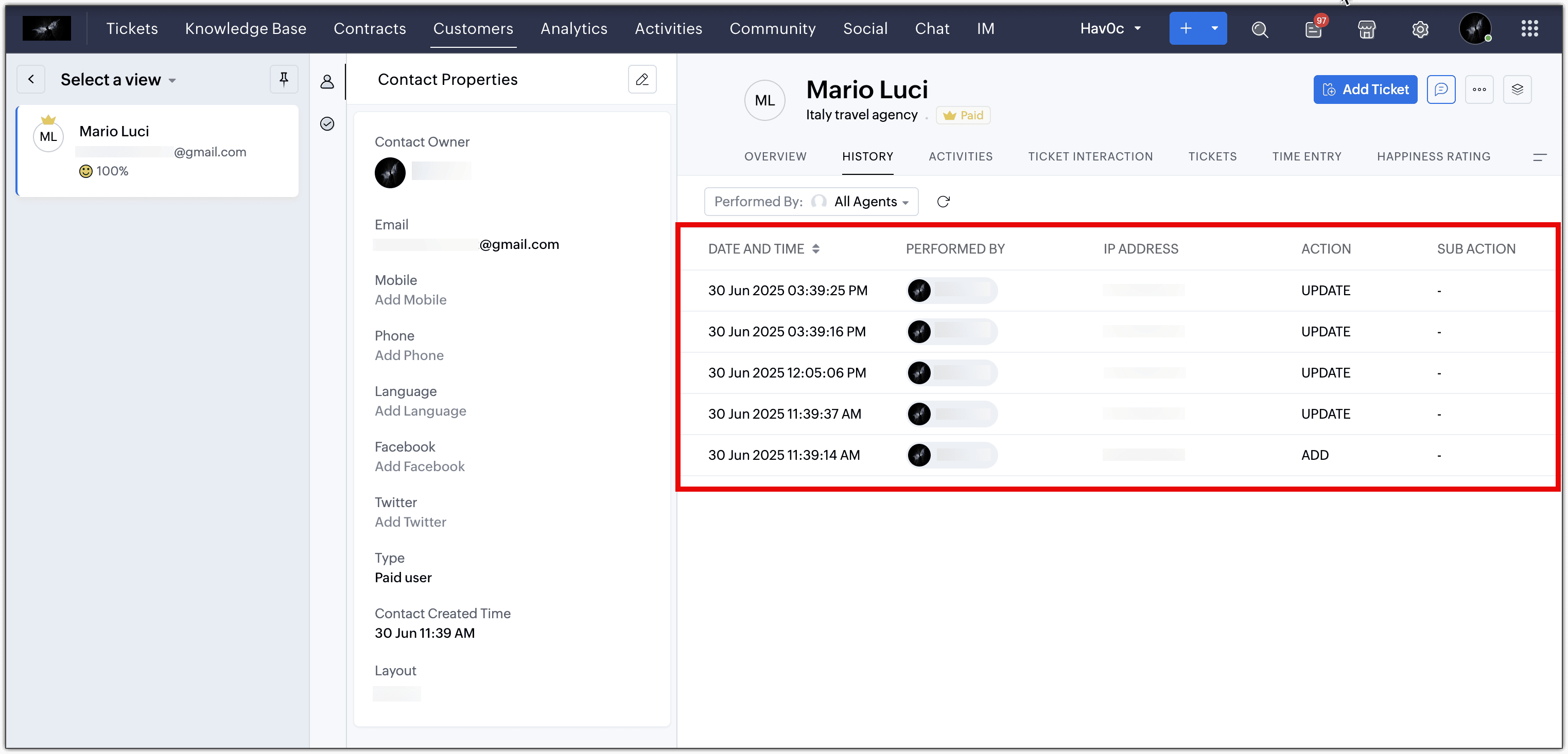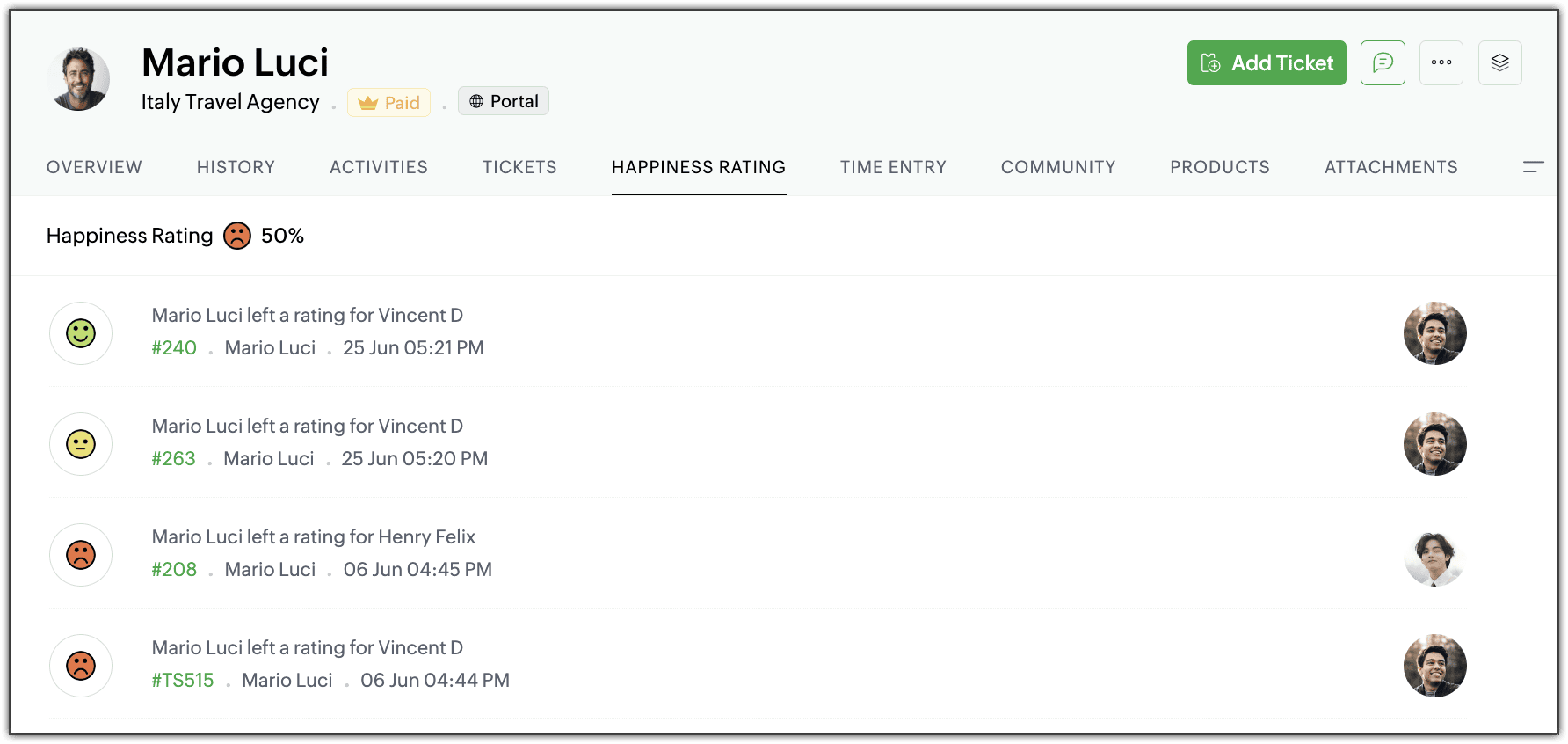 This tab displays the feedback provided by the contact to the agent after their ticket is closed. It includes a timeline of all submitted ratings, along with the name of the agent who handled the ticket, the corresponding ticket number, and the time the rating was submitted.