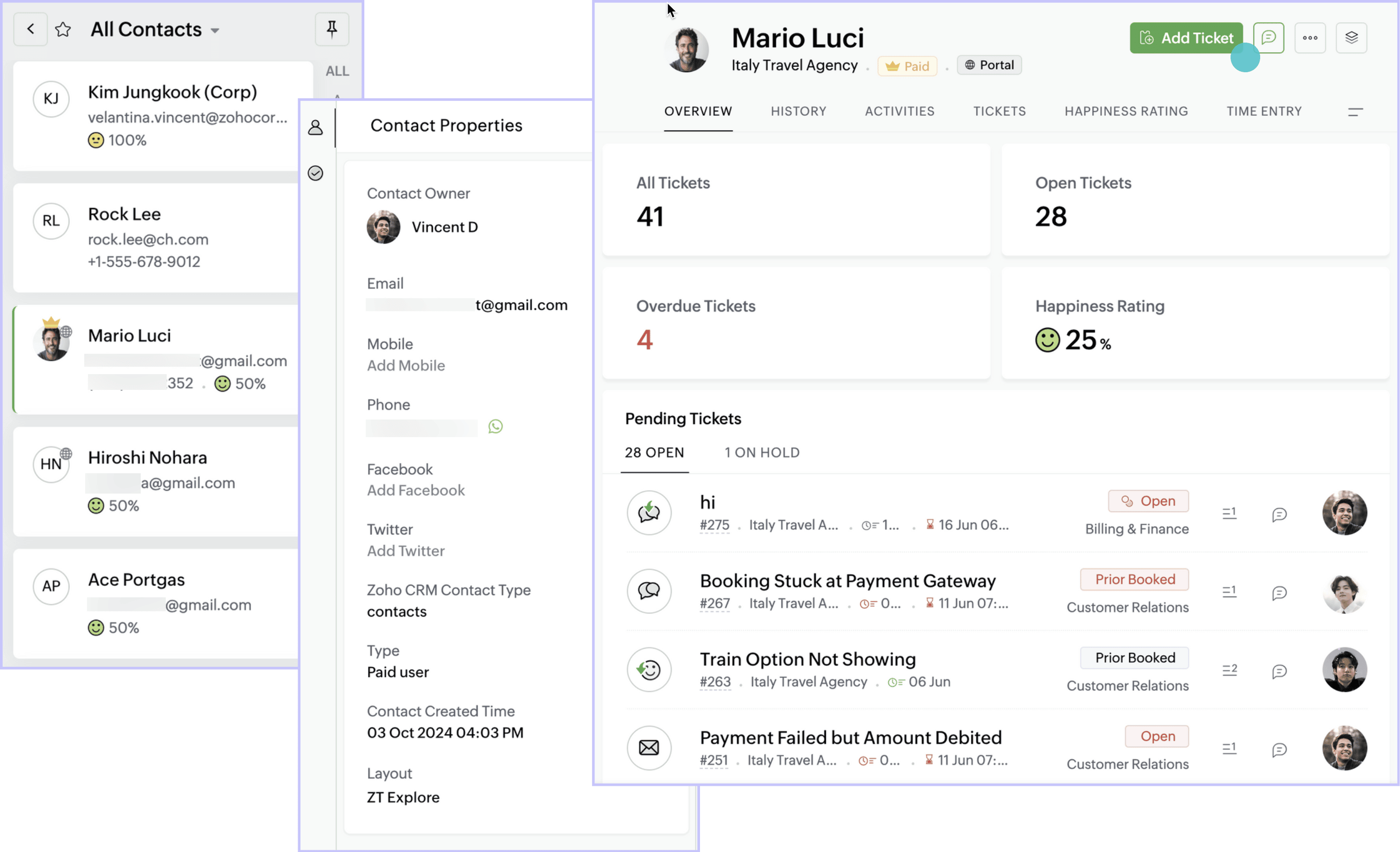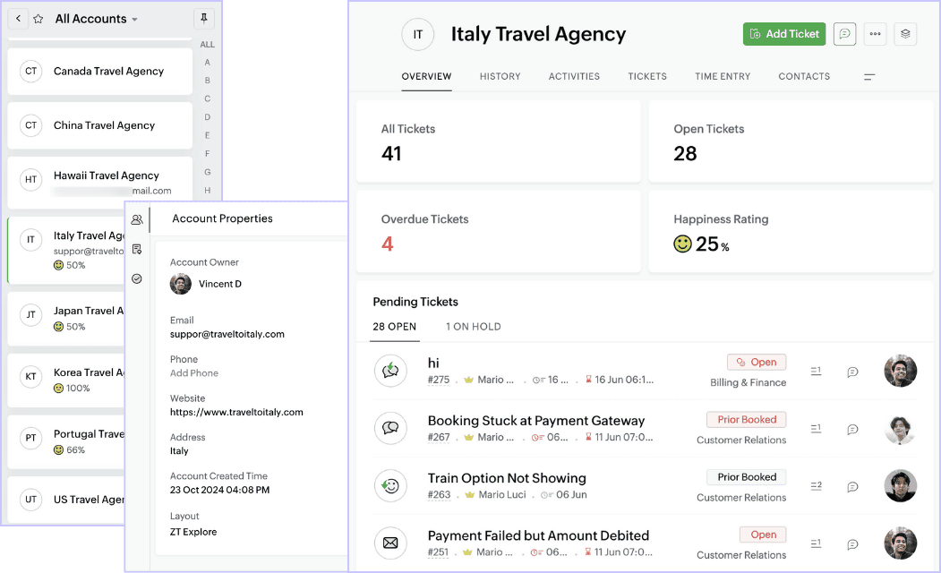 - Contact Properties / Account Properties - Shows all key properties such as contact/account fields, custom fields, ticket summary, and other essential information for reference.
