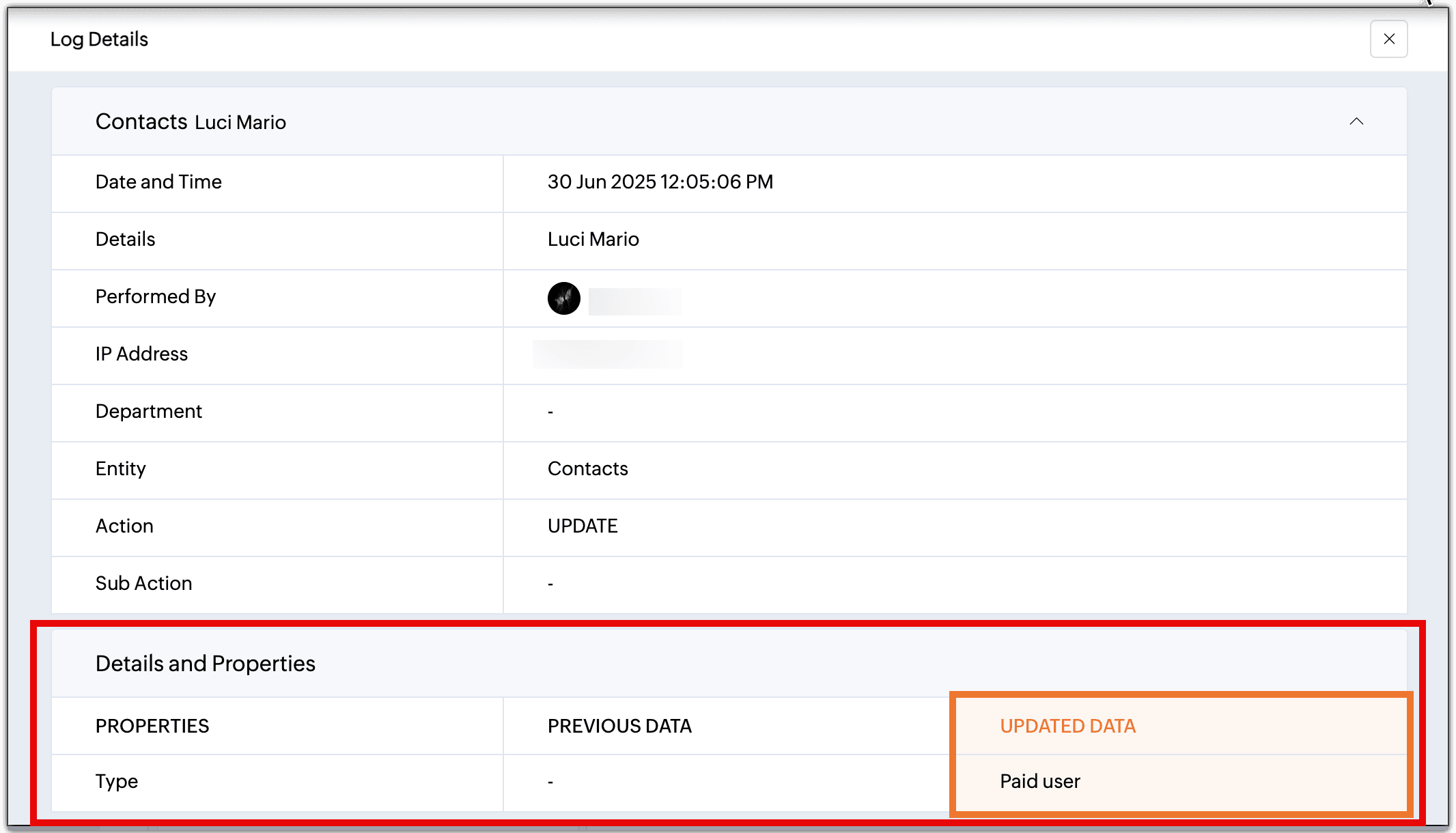 Under Details and properties, users can view the information the contact or account owner entered at the time of creation. Also, the Previous data and Updated data values of each field are clearly indicated.