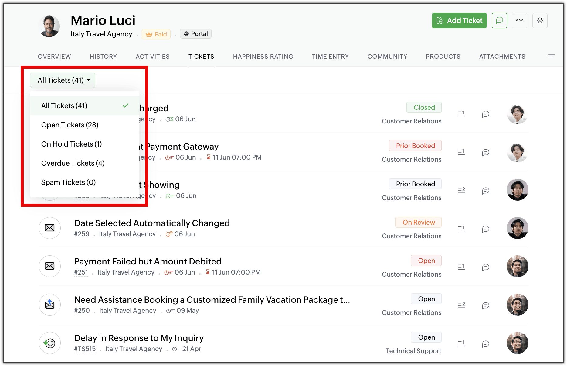 All the tickets that the contact or the account has submitted or are associated with will be displayed under the Ticket tab. These tickets can be filtered as All Tickets, Open Tickets, On Hold Tickets, Overdue Tickets, and Spam Tickets.