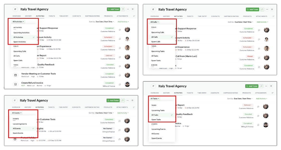 - All Activities | All Calls | All Events | All Tasks: A complete list of activities—past, present, and future.