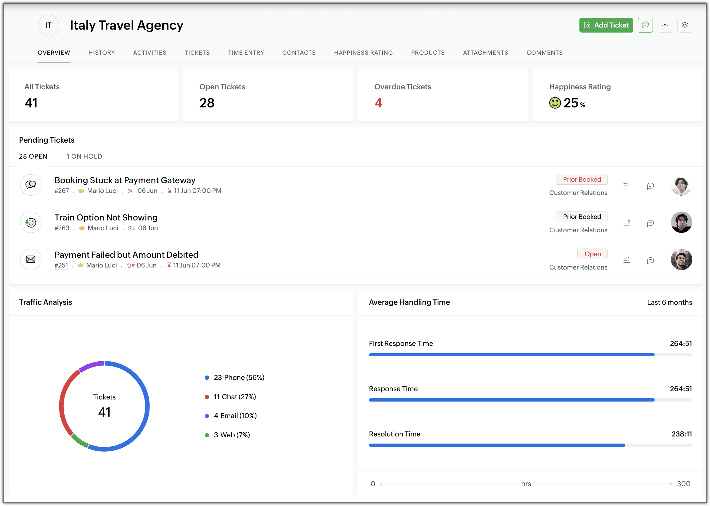 - Overdue tickets: The total number of open tickets associated with a contact or account that have crossed their due dates.