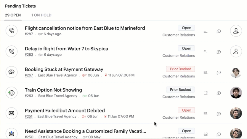- Pending tickets: The list of all the tickets that are not yet resolved and are in statuses such as Open, On Hold, or In Progress. The tickets are categorized into different tabs.
