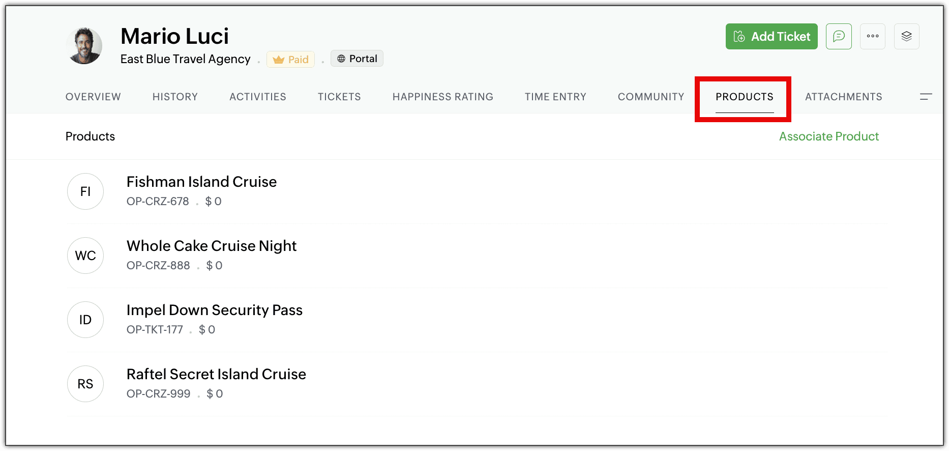 If contacts or accounts are associated with the Products module through a lookup field, the Products tab can help lookup the various products the contact or account has purchased. When looking at a contact, you can view the products that are related to it. Products can be associated with other contacts from this tab.