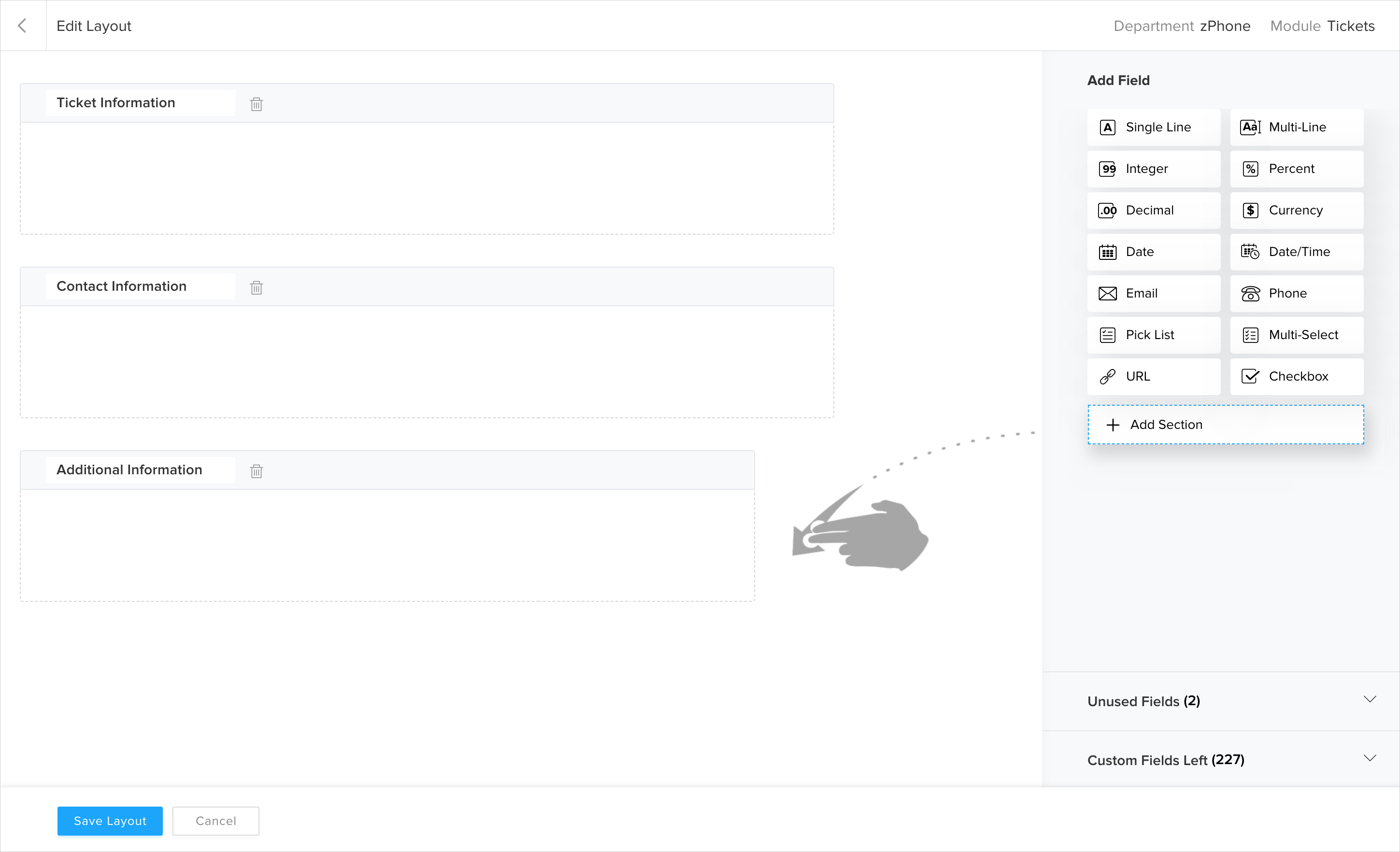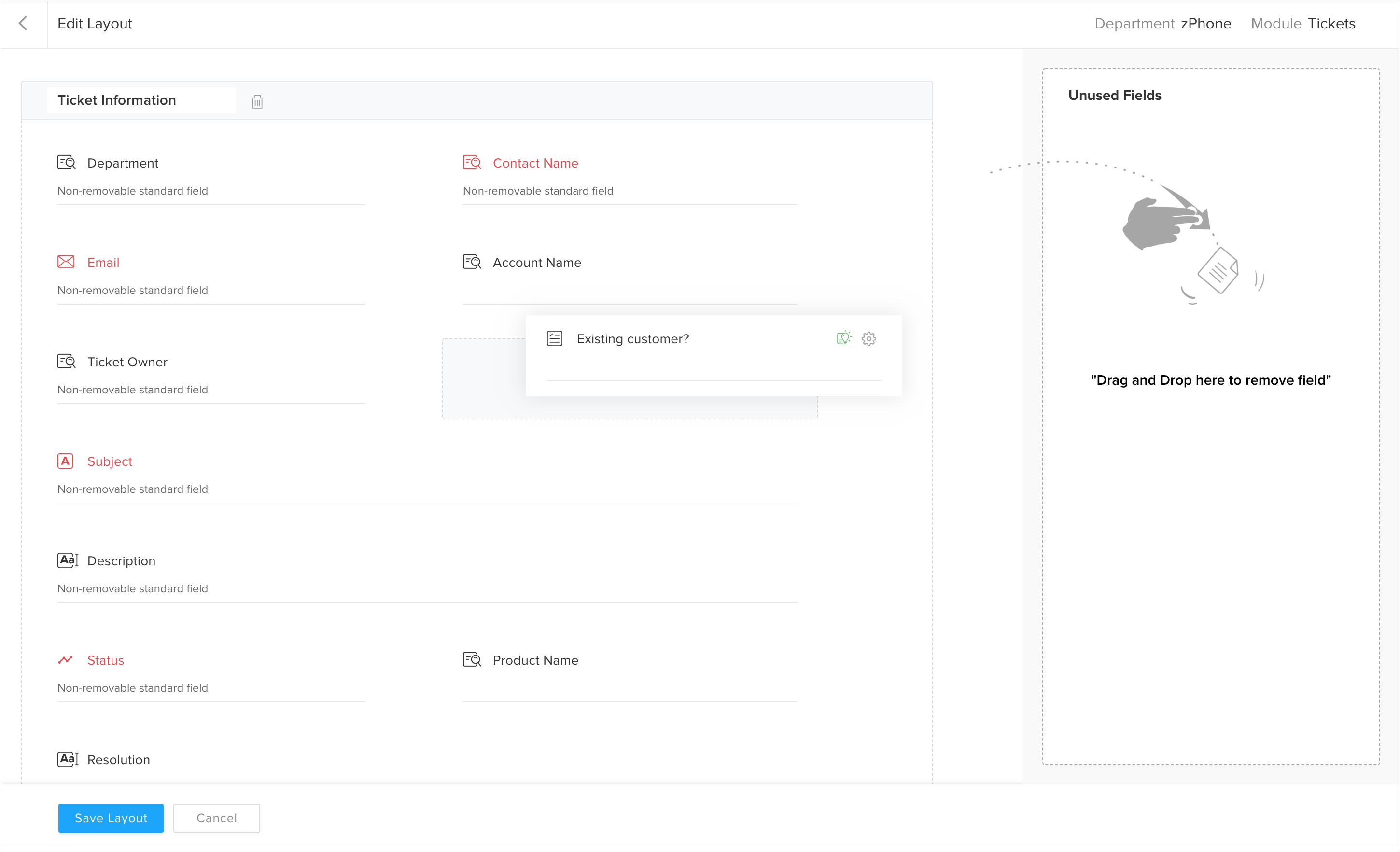 You can use layouts to customize the fields on the module pages like Tickets, Tasks, etc. Also, the drag-and-drop feature allows you to add new fields, remove unused fields and re-order fields as per your requirements.