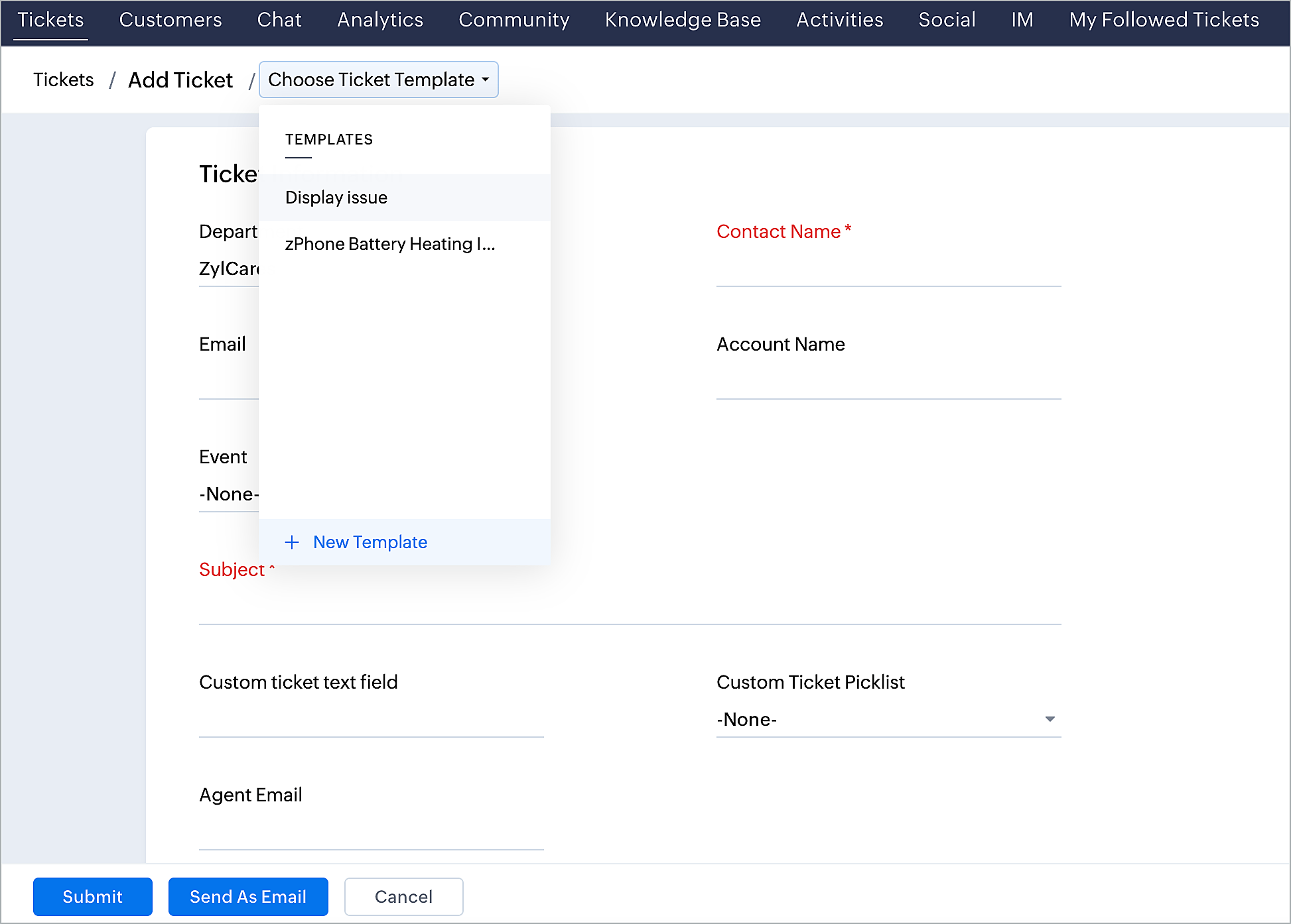 Ticket TemplatesTicket templates are used to automatically populate some pre-defined values into the ticket fields while adding a new ticket. It saves a lot of time and effort each time when you add a ticket for customers over the phone. Also, customers can select a ticket template when they submit a ticket from the Help Center. Usually, ticket templates will be created by your support manager based on the requirements.