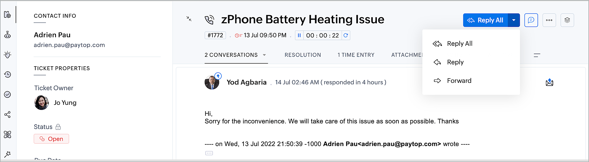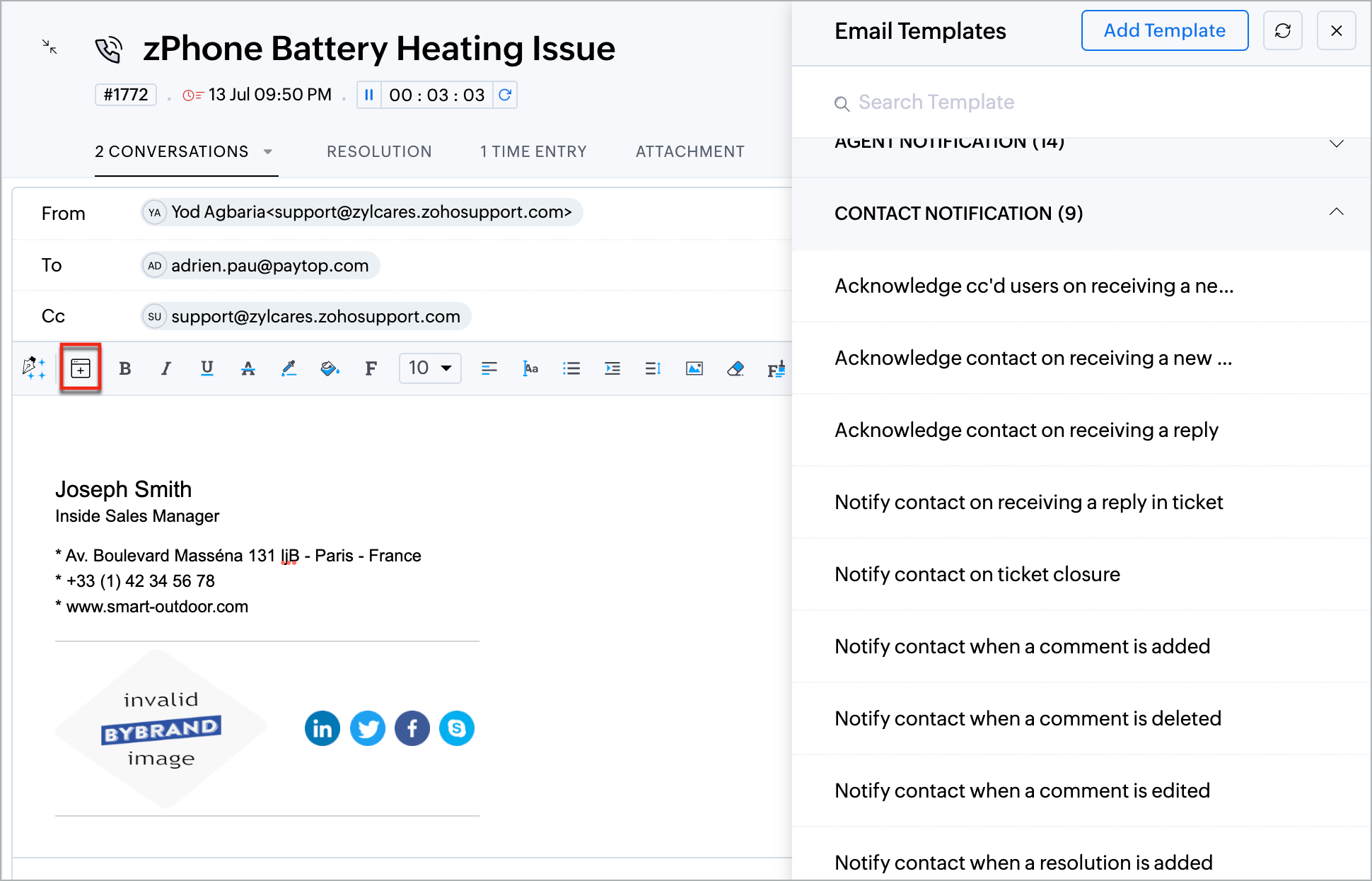 - You can apply the email template while replying to tickets in Zoho Desk.