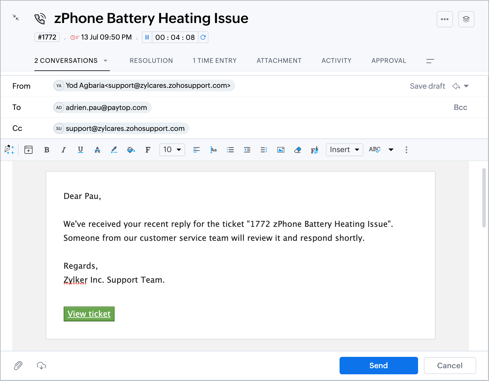 - Agent(s) with necessary Email and Ticket Template permissions can draft and use email templates in a ticket.
