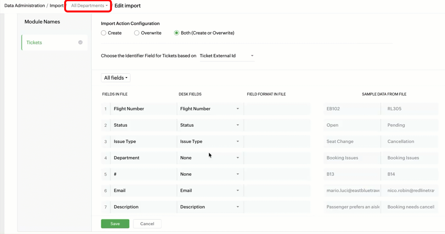 Permission Required Zoho Desk allows admins to import tickets, accounts, contacts, products, tasks, events, calls, custom modules, and KB articles. Only a ZiP file with CSV files can be uploaded. The ZIP file must contain one file per module. All files have to be zipped together before uploading. For example