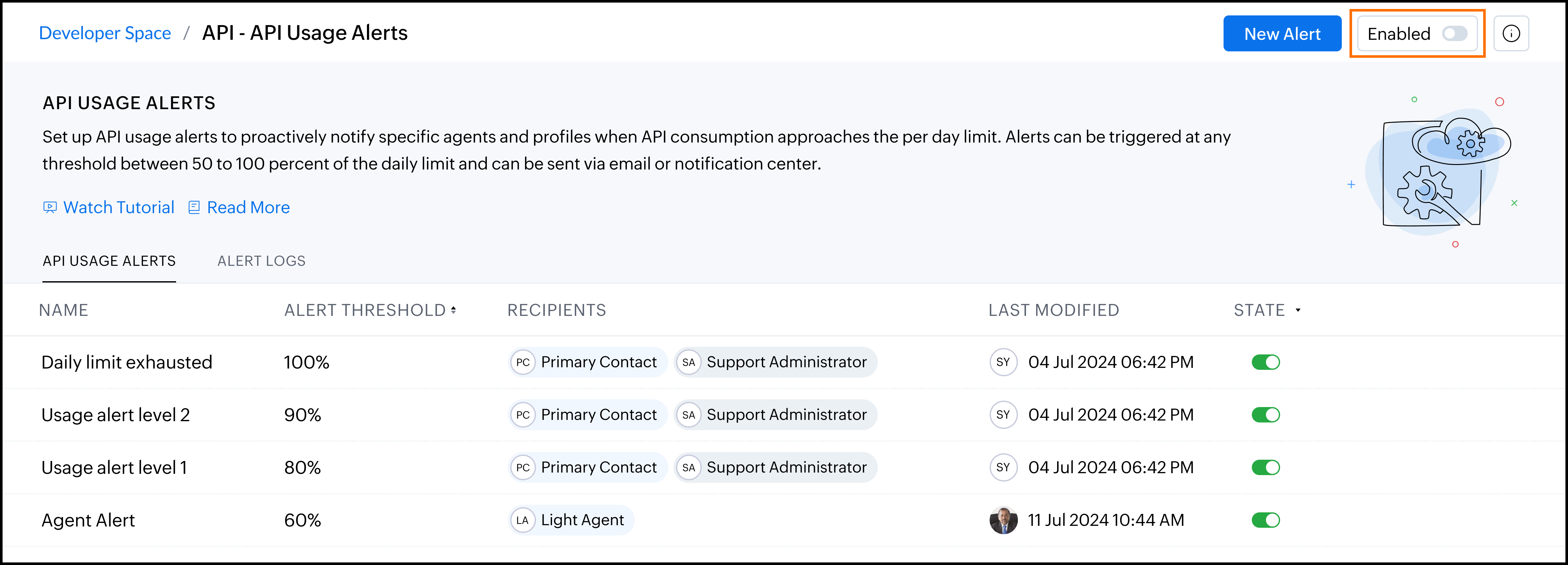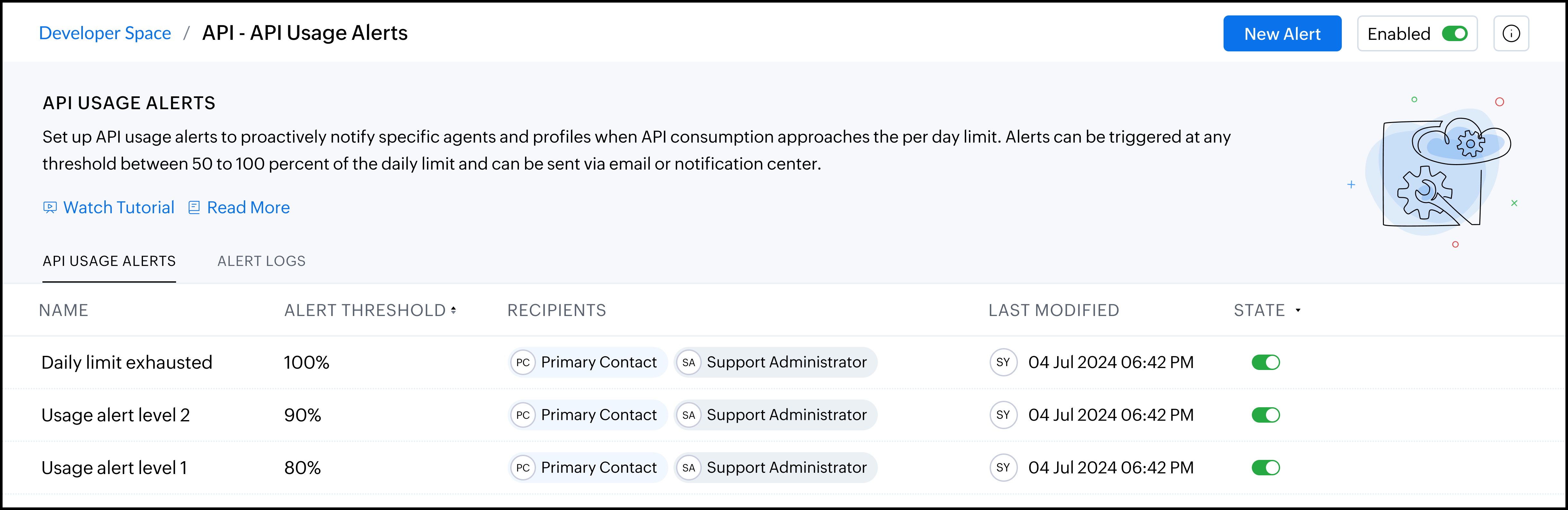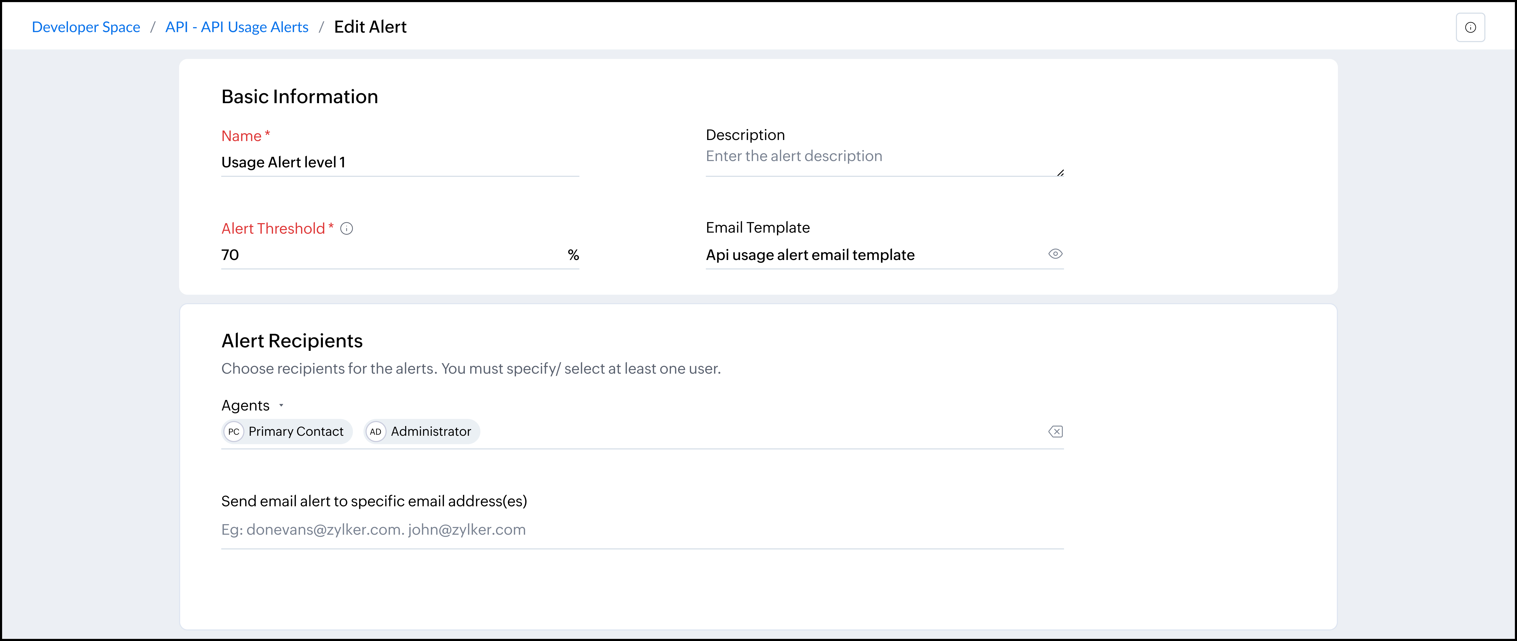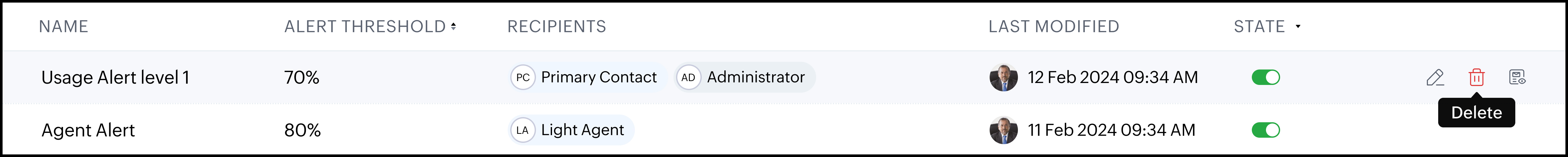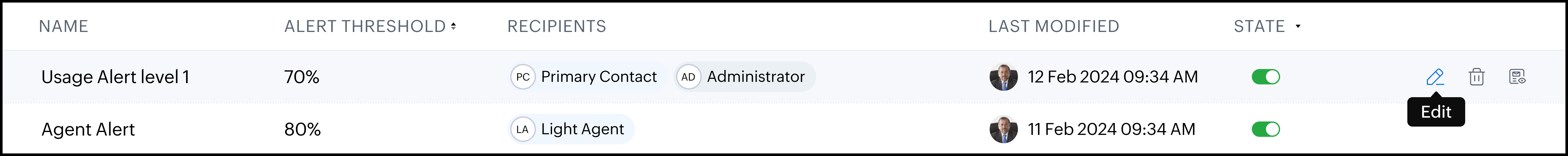 1. When users access this feature for the first time, three default alerts for 80%, 90%, and 100% threshold limits are automatically configured. These alerts are designed to notify the primary contact and all agents in the support administrator profile whenever the specified threshold limits are reached. These alerts can be edited or deleted as needed.