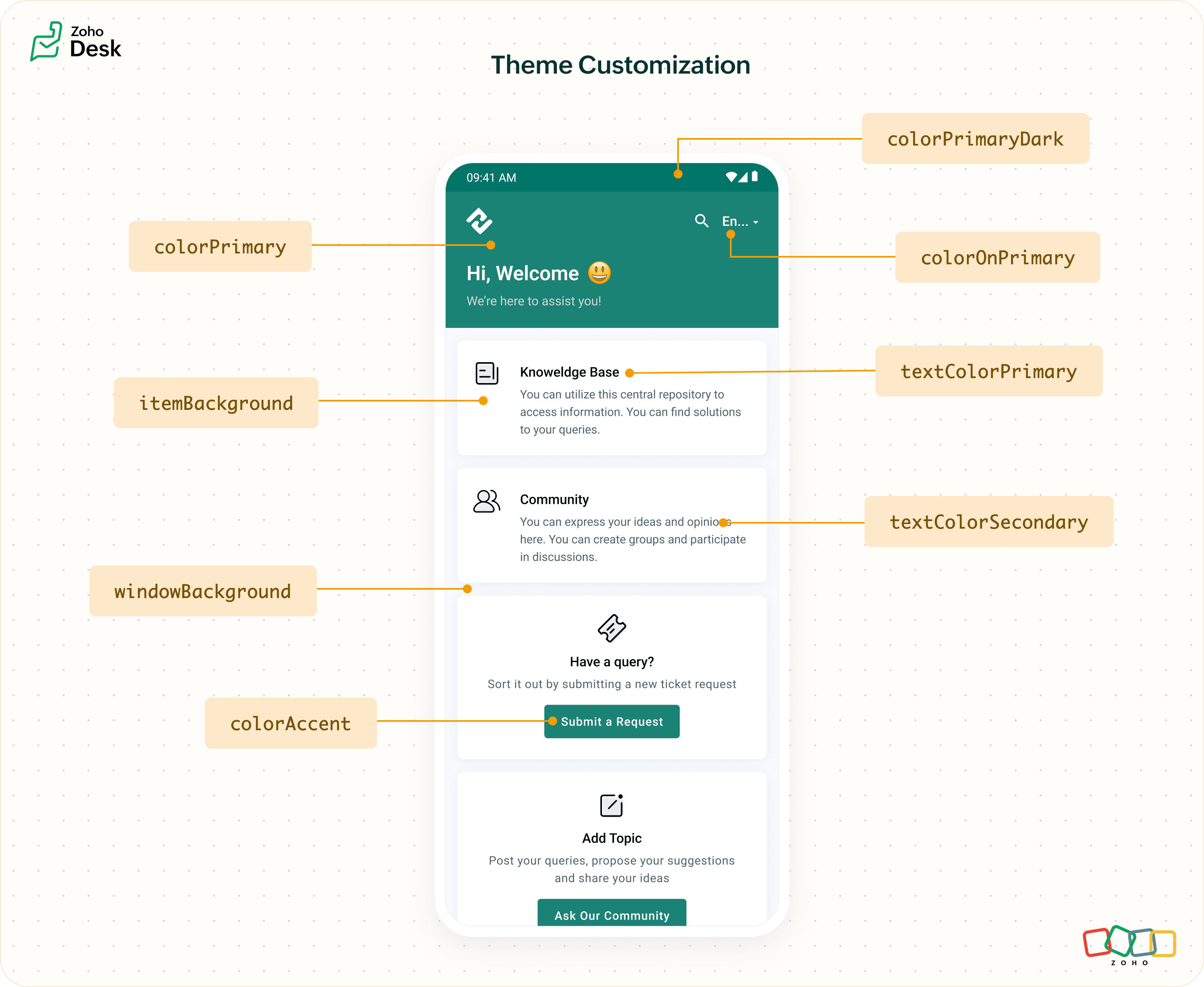 [RNZohoDeskPortalConfiguration updateLightTheme:myCustomLightTheme]; // CustomTheme For LightTheme