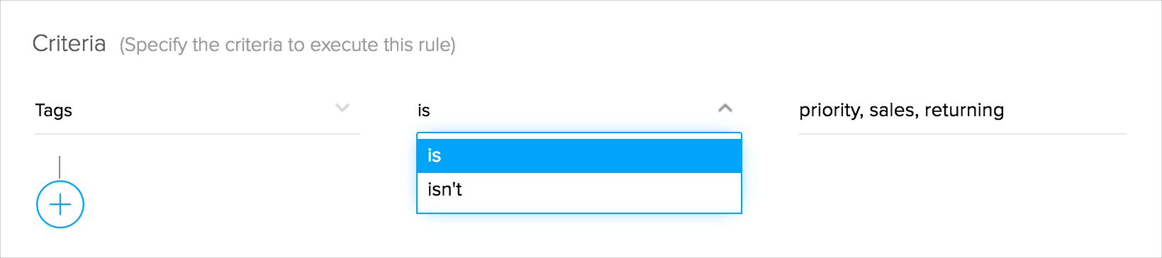 Yes, you can create automation rules that trigger some actions when you add a specific tag to a ticket. For example, based on a tag, you can automatically assign tickets, send alerts, create activities, set due times, and more. You can add tags as a condition in assignment rules, workflows, blueprint, SLAs and supervise. To do this, build a condition statement to include or exclude tags by using the operators "is" or "isn't".