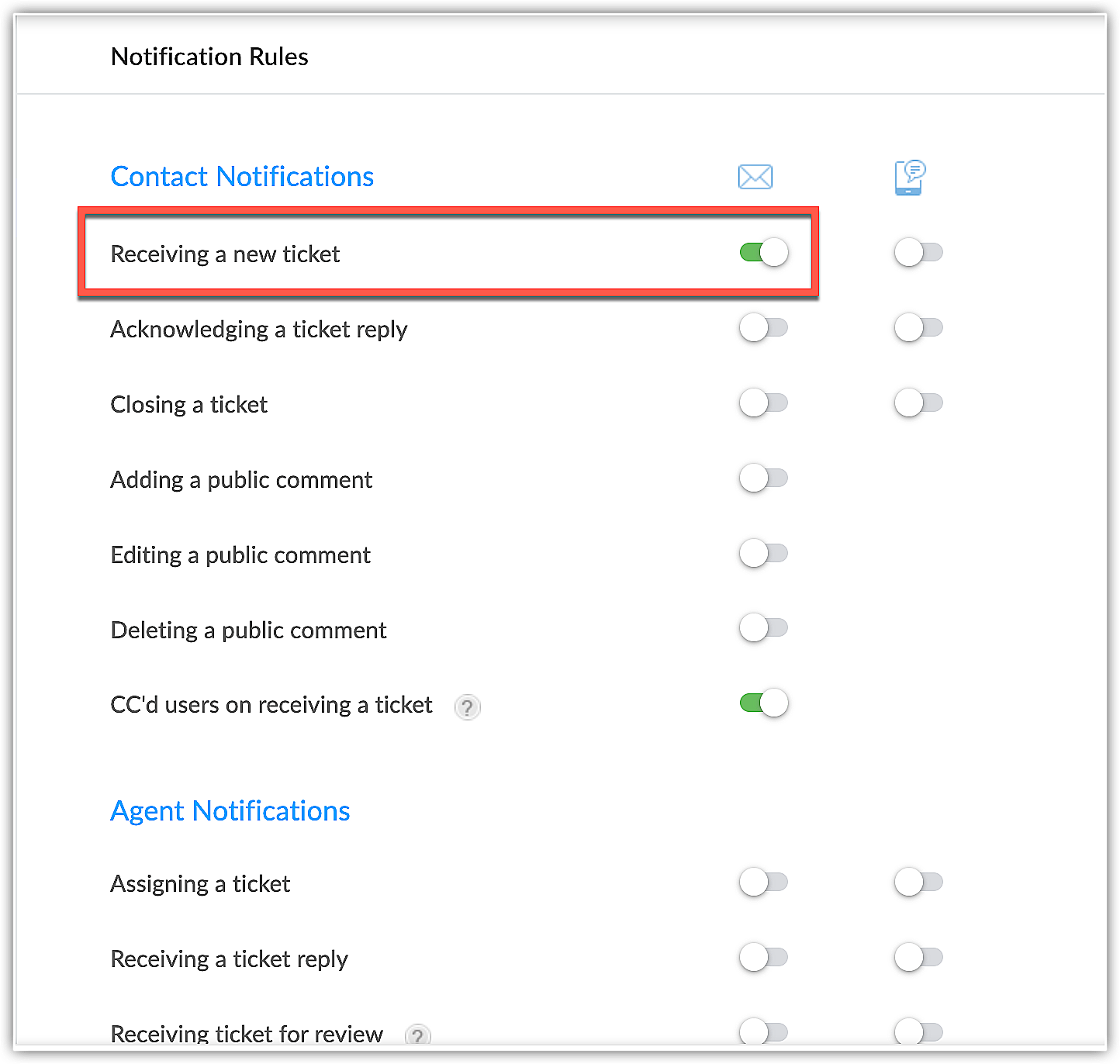 Toggle on Receiving a new ticket for email or SMS under Contact Notifications.