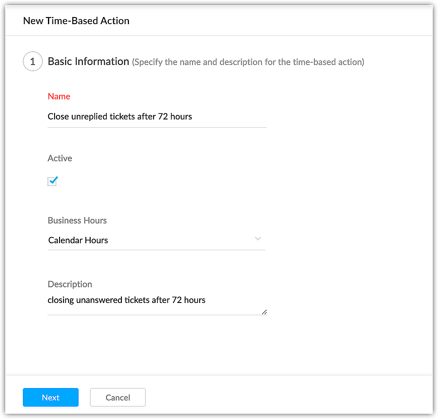 On the New Time-Based Action page, fill in the Basic information such as Rule Name, Business Hours, and Description.
