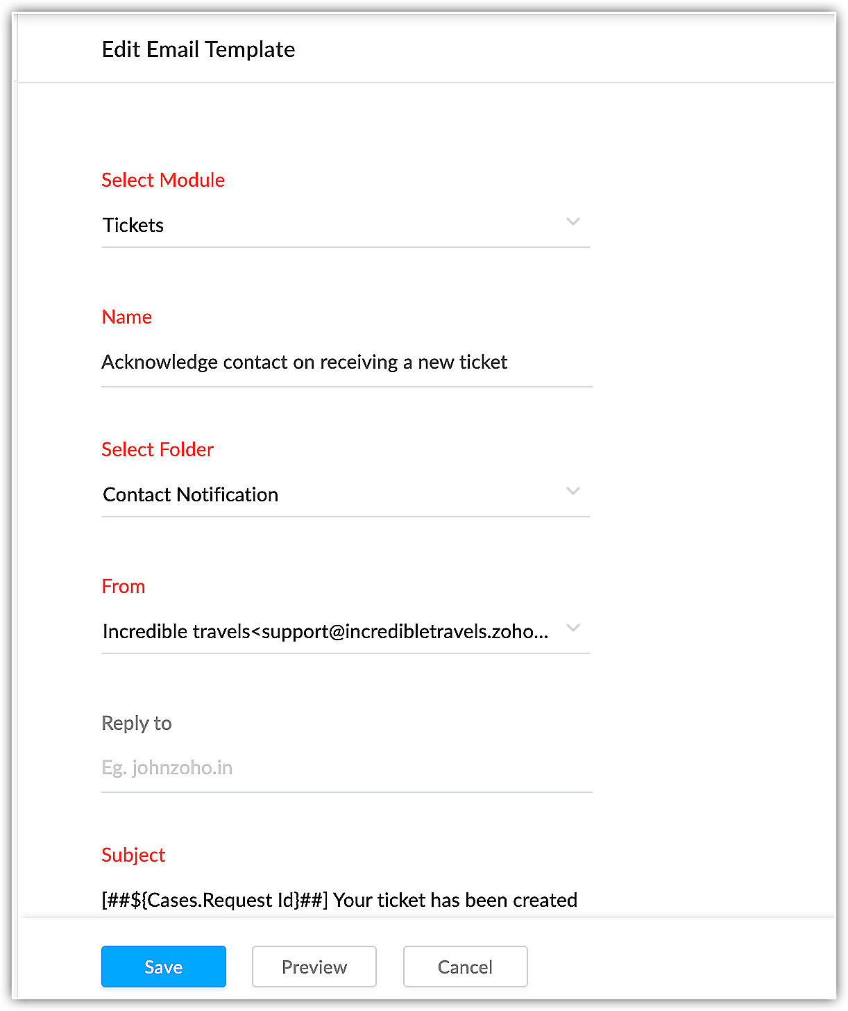 With Zoho Desk, when a customer raises an inquiry or request for resolution, you can make sure that they get an acknowledgement email stating that their ticket has been created, along with the case/ticket ID, and reassurance that an agent will get back to them with a proper resolution. A user with a Support Administrator profile can set up automated acknowledgement notifications in your Desk account.