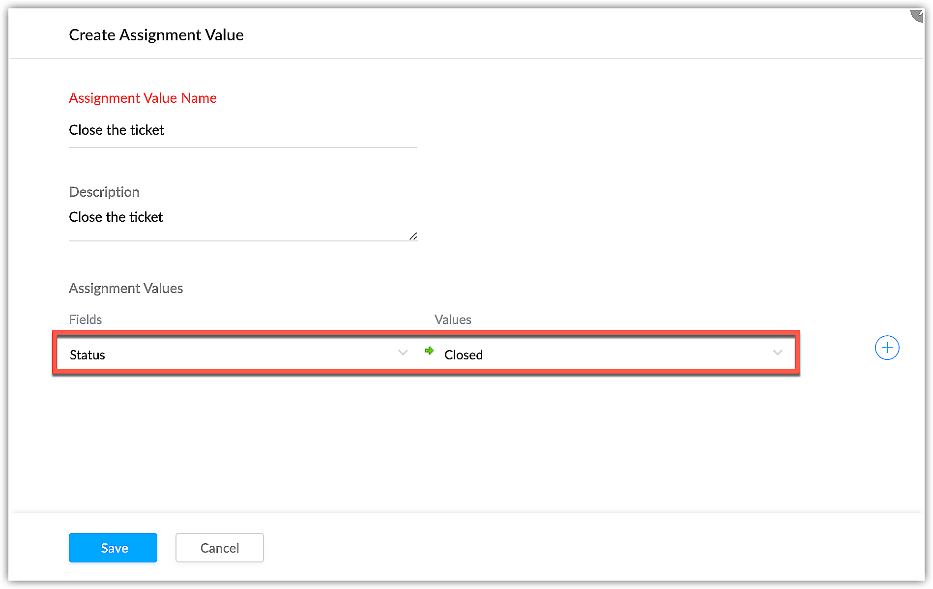 Under Assignment Values, set Fields to Status and set its value to Closed from the dropdown.