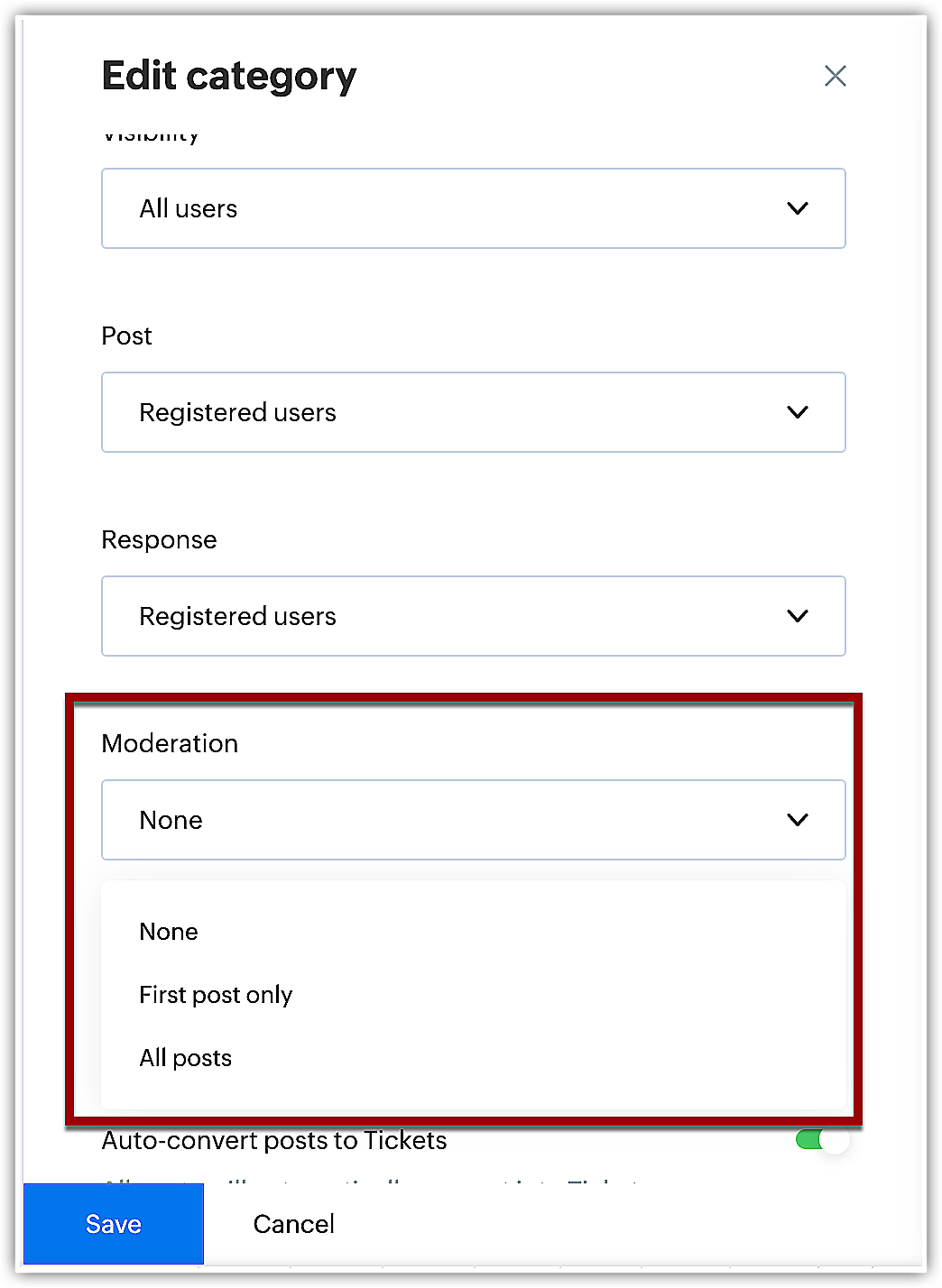 On the Edit Category page, under Moderation, select None from the drop-down menu.