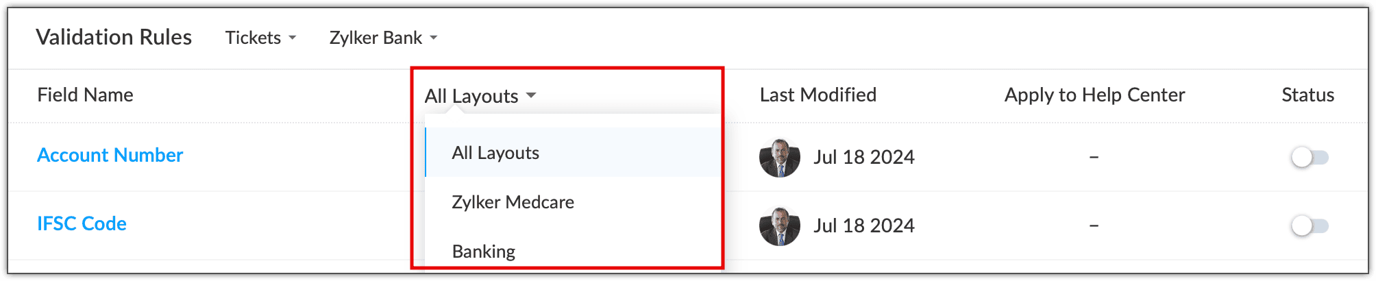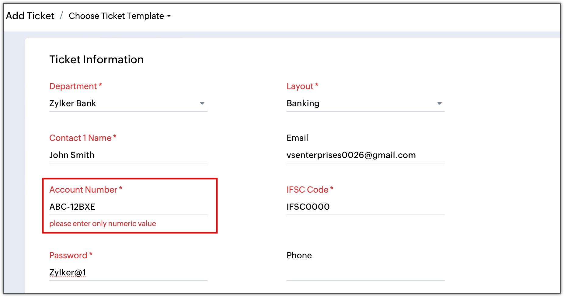 Validation rule provides businesses a way to ensure that the data entered by the customers and the employees is correct and meets their standards. It helps maintain data authenticity. When customers submit tickets or agents create tickets on behalf of the customers, they enter certain values into the fields. Businesses can ensure the entered values are accurate by setting a validation rule. Likewise, when agents enter data, such as product code, serial IDs, and customer details, these values can be authenticated using a validation rule.