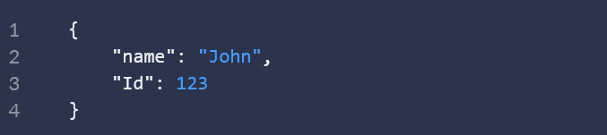 Here, "name" and "Id" are the keys and "John" and 123 are the values.