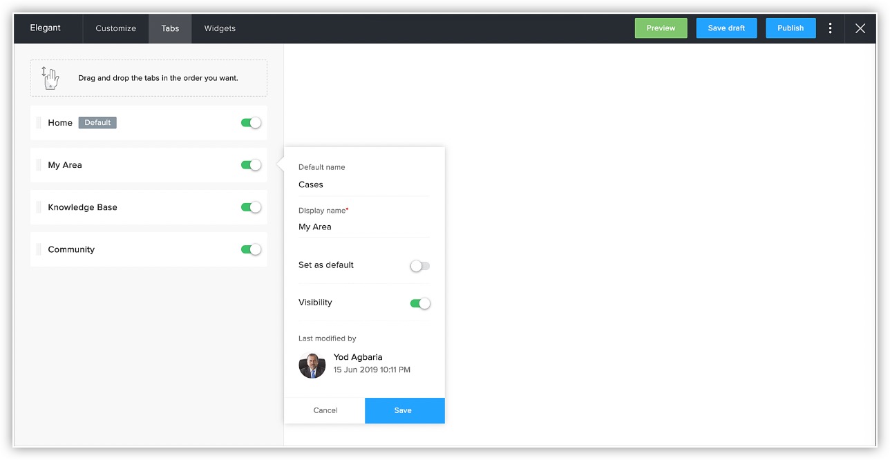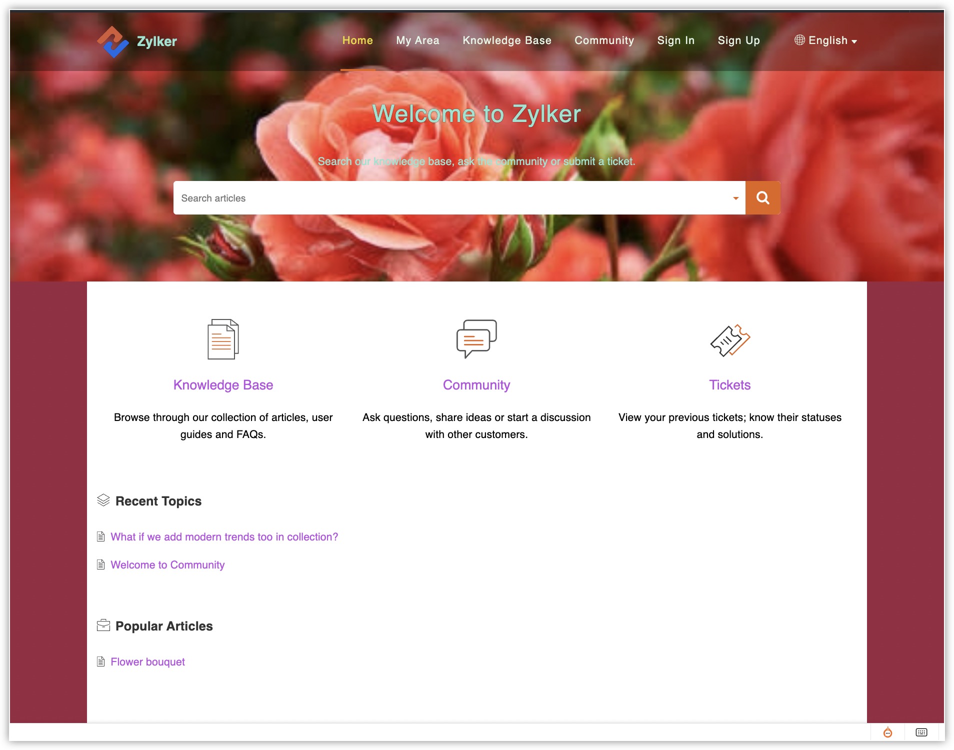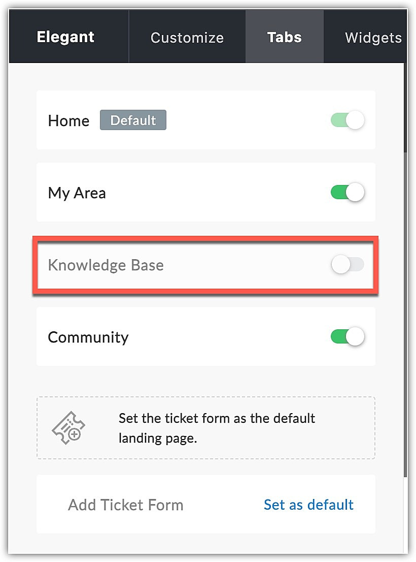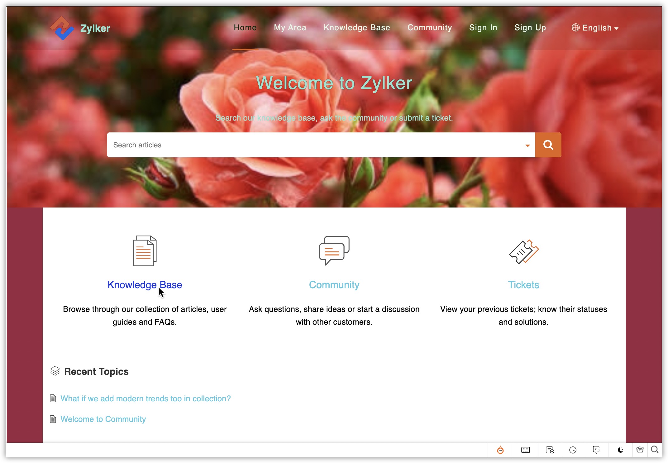 Zoho Desk provides the following tabs by default: Home, Knowledge base, Community, and My Area.