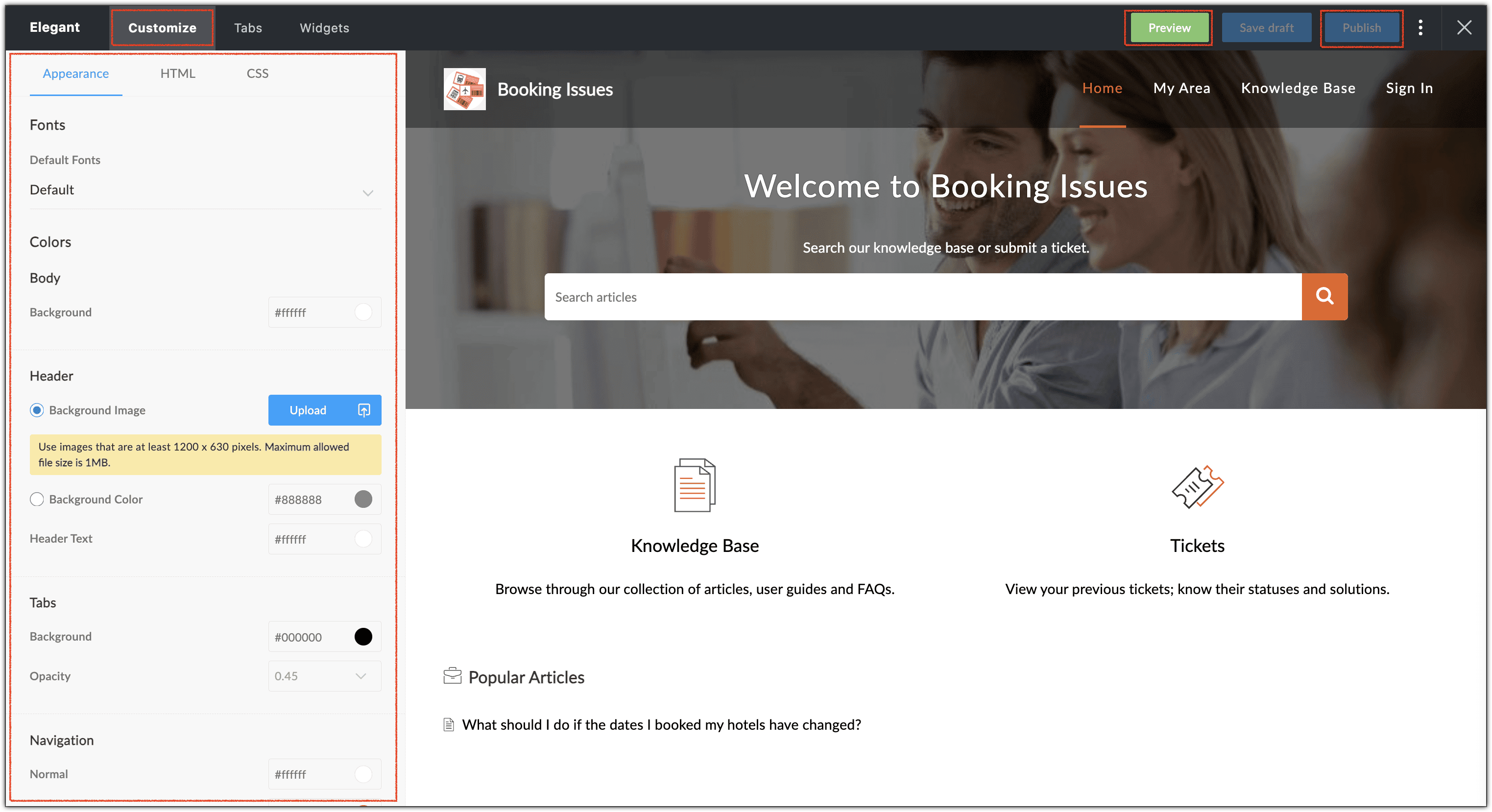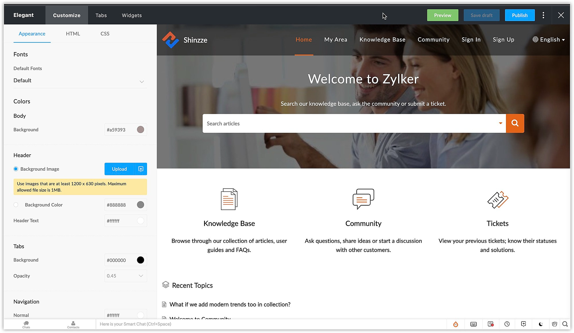 Zoho Desk provides customization options to help you align your portal (Help Center) with your brand. You can customize the following elements: