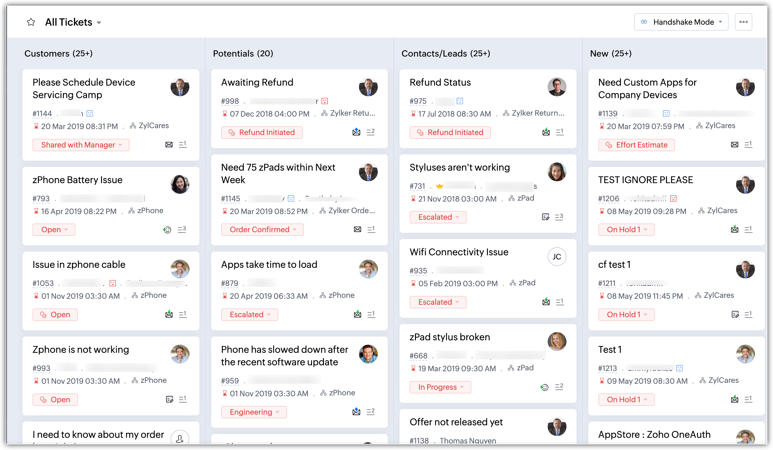 Manual ticket prioritization isn't just an inconvenience, it also takes valuable time away from the important tasks of your help desk. The Zoho Desk Handshake mode organizes your help desk tickets into columns based on customer type in Zoho CRM, allowing your support team to focus on support. Handshake mode has been exclusively designed for Zoho CRM to give the real time status of the records in order to prioritize tickets based on those inputs.
