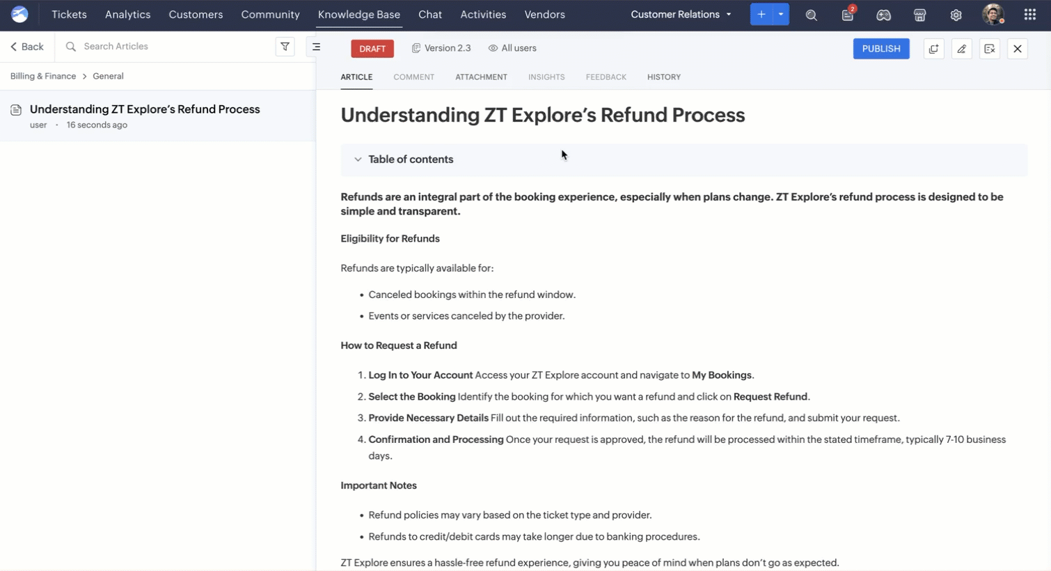 Users can make small, immediate changes without creating a new version of the article. | When users edit an existing document, the changes are temporarily saved as a draft before being published as a new version. |