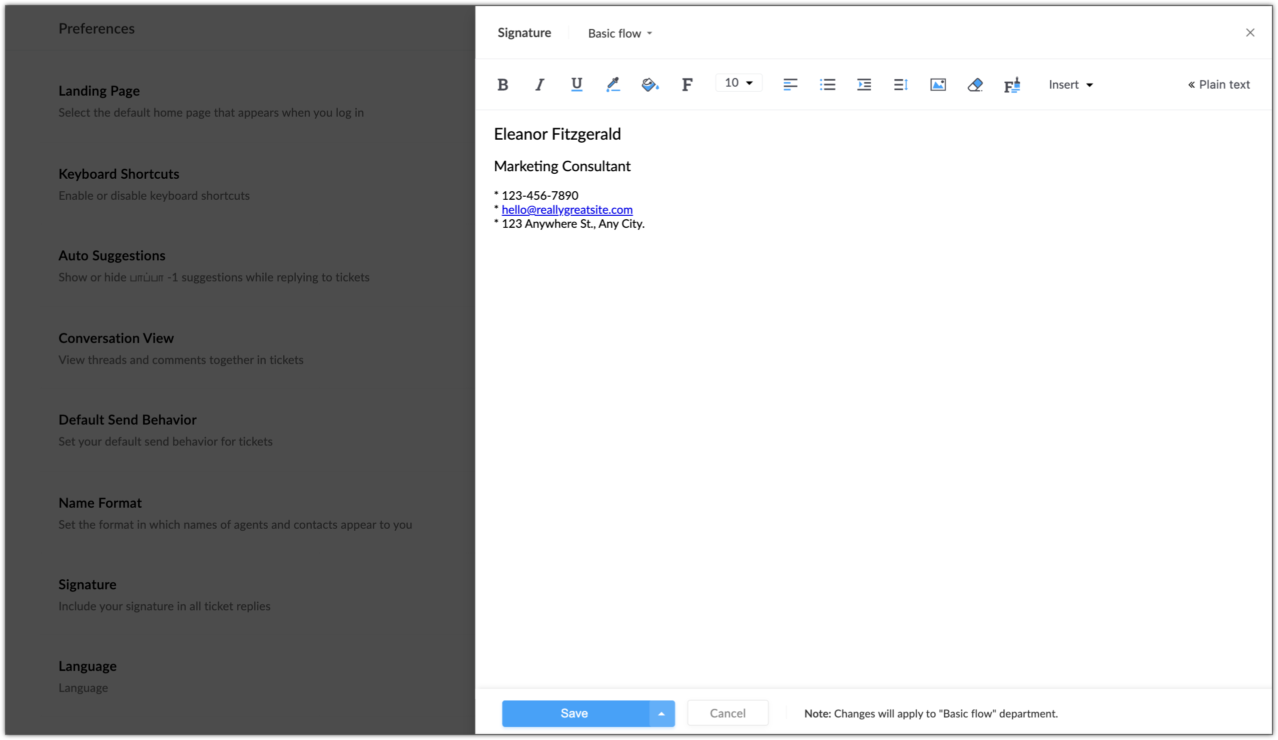 You can add your custom signature in the reply emails sent from Zoho Desk, and get connected with your customers in real time. The signatures can be added either department-wise or commonly for all departments.