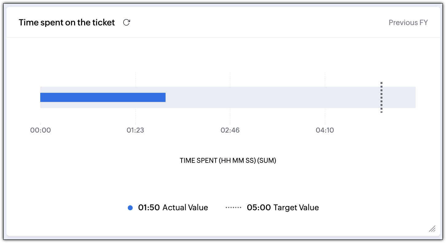 For example, if you want to optimize the time every agent spends on a ticket, you can set a target value and monitor the actual time taken by the agents to resolve the ticket. In the image below the actual time spent on the ticket is 01:50 minutes and the target is 5:00 minutes, which indicates a good performance .