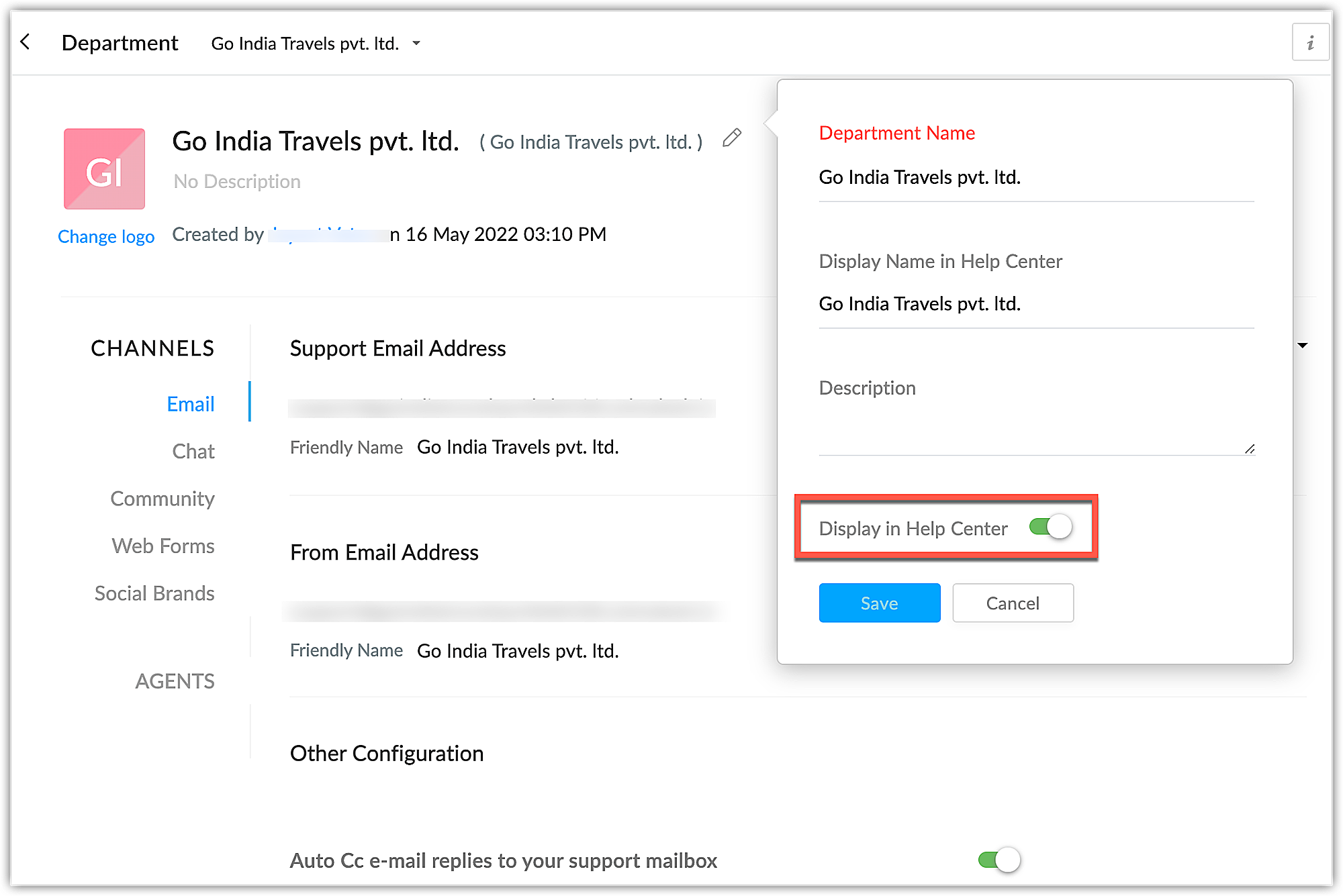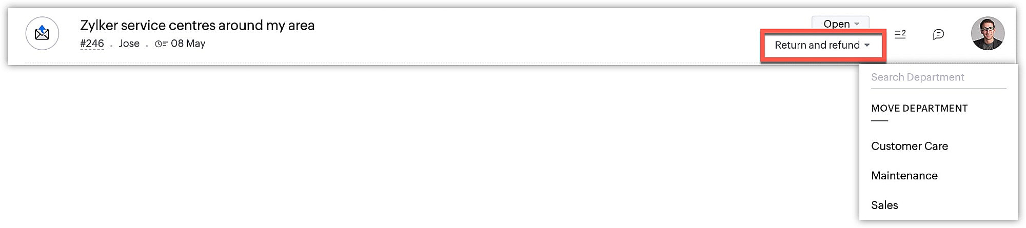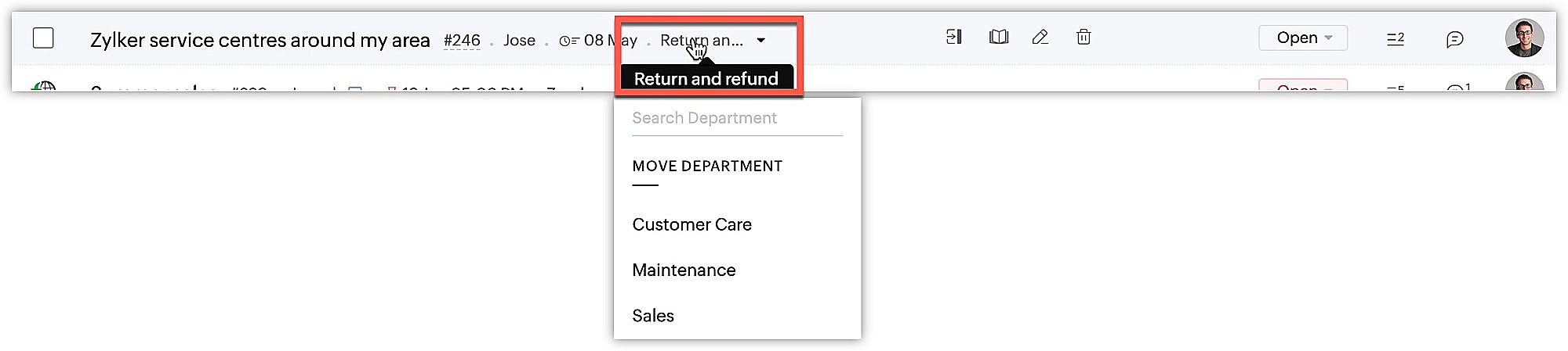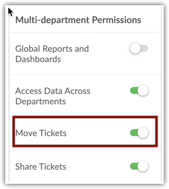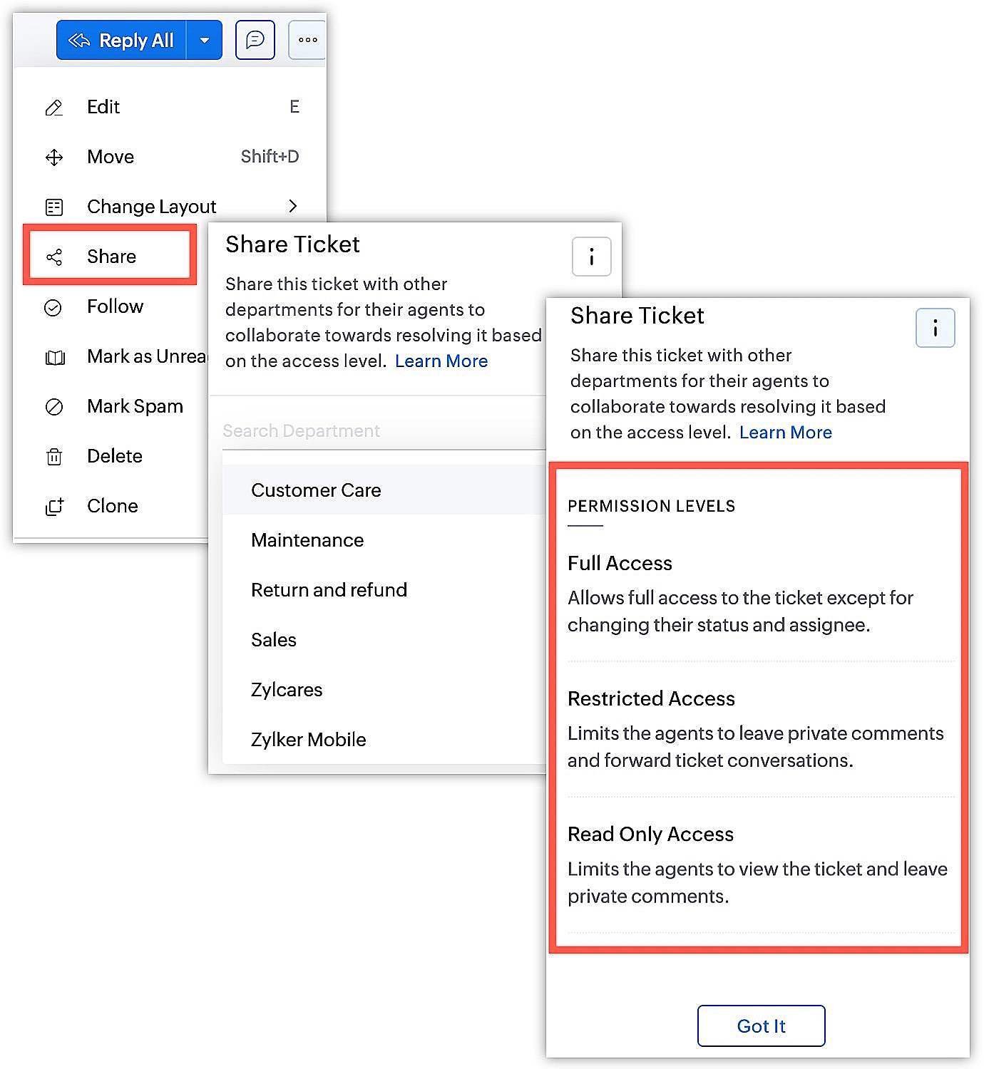 Once moved, agents lose control over the ticket in the source department. If the agent is added to the other department, they can access the ticket. Or else it will be inaccessible to them. | Once shared, agents get the access to the ticket in the parent department. |