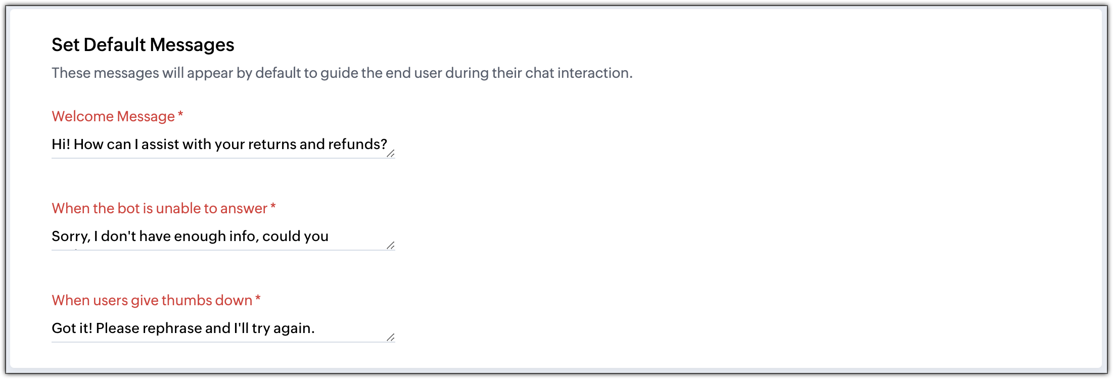 • When users give thumbs down: Appears when users give negative feedback, offering another attempt to assist. For example, “Sorry about that! Let me give it another try.”