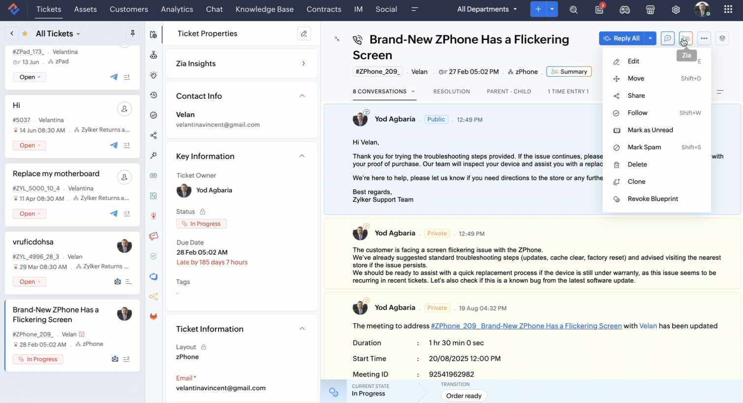 How is Zia's integration with ChatGPT useful for my business? The power of generative AI (ChatGPT) coupled with Zia's capabilities can bring a spectrum of benefits to the customer support processes in businesses Contextual responses to tickets: Zia ...