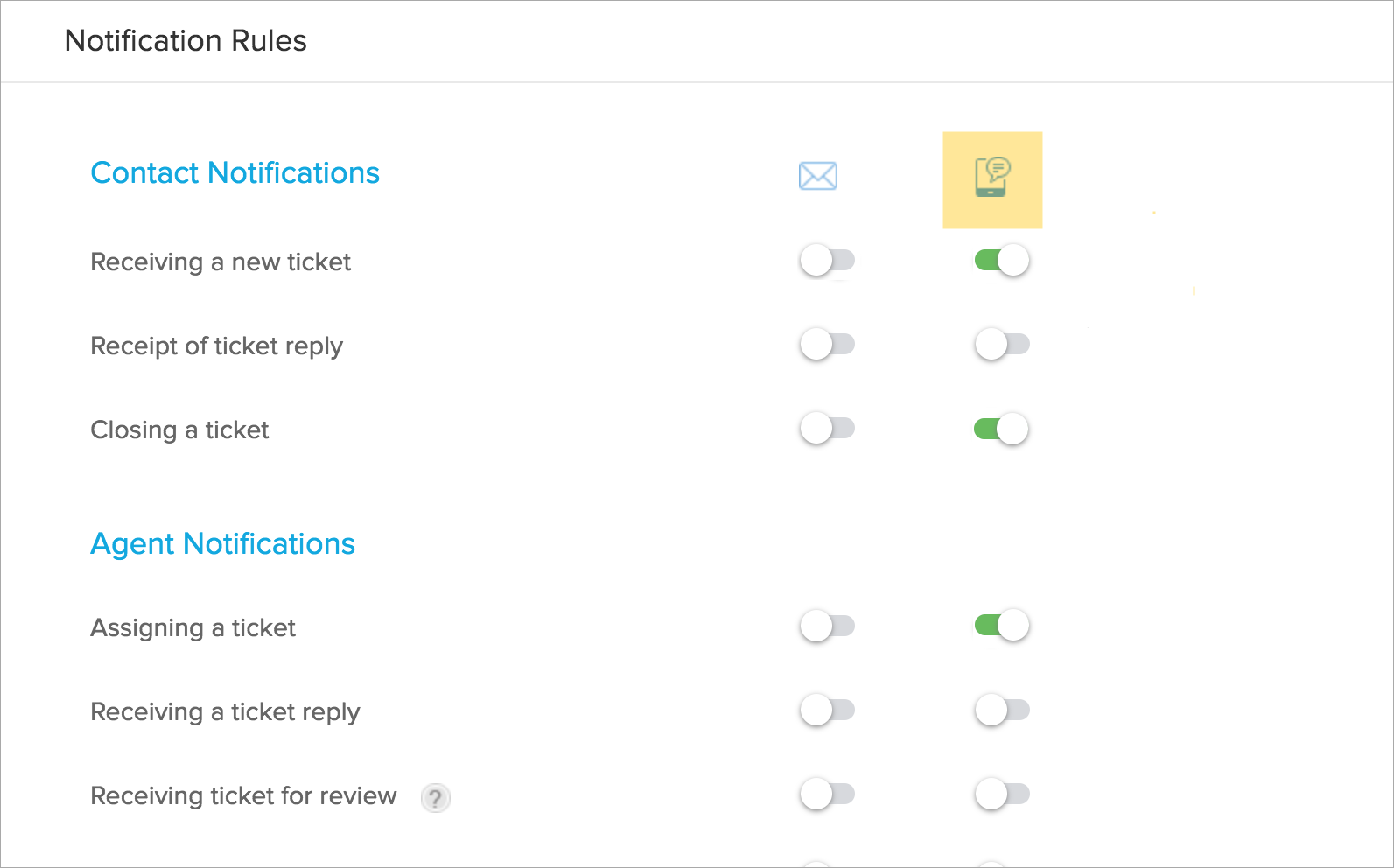 Zoho Desk will provide you with a set of notifications rules by default. You can enable or disable the rules for SMS messages as per your preference.